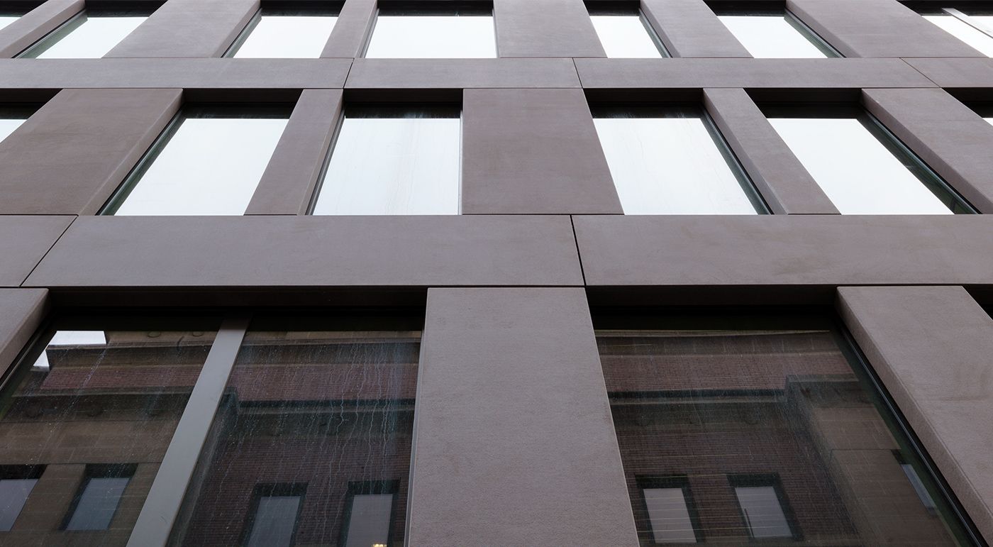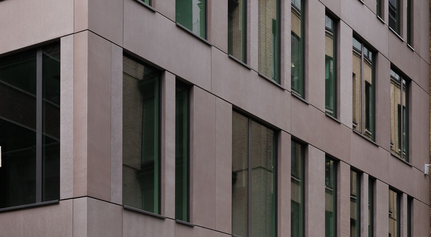 Fletcher Priest Architekten zeigen sich für den Neubau von 98 Fetter Lane verantwortlich. Das Gebäude in prominenter Lage umfasst Handels- und Büroflächen. Der ehemalige Komplex aus den 50er-Jahren wurde abgerissen und durch ein neues Bürogebäude ersetzt. Der Neubau bietet Platz für 60.000 m² Gewerbe- und Geschäftsflächen auf acht Etagen. Die Architekten verkleideten die Außenhaut mit concrete skin Platten und formparts in terra und polar white. Die Elemente ziehen sich, gleich einer Haut, geschmeidig über die Ecken und erzeugen einen einzigartigen Materialfluss.