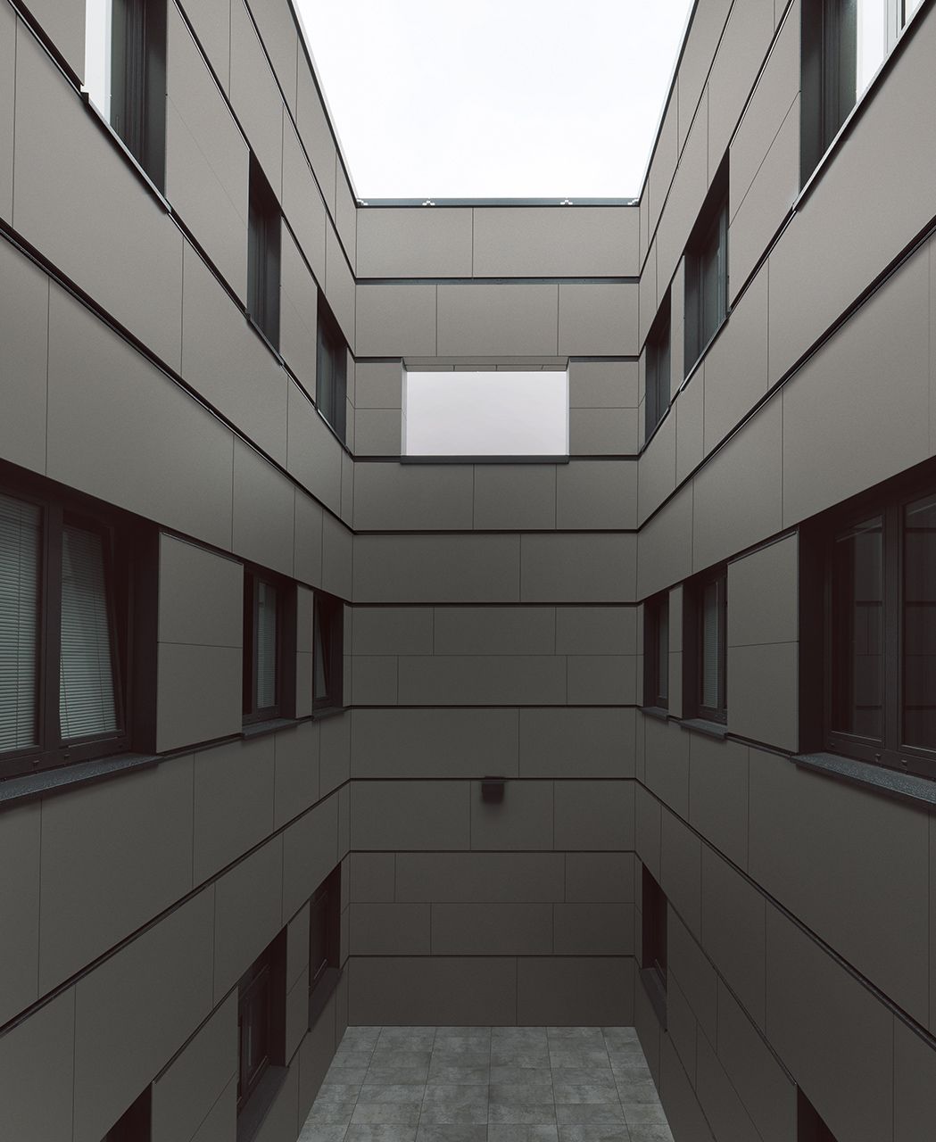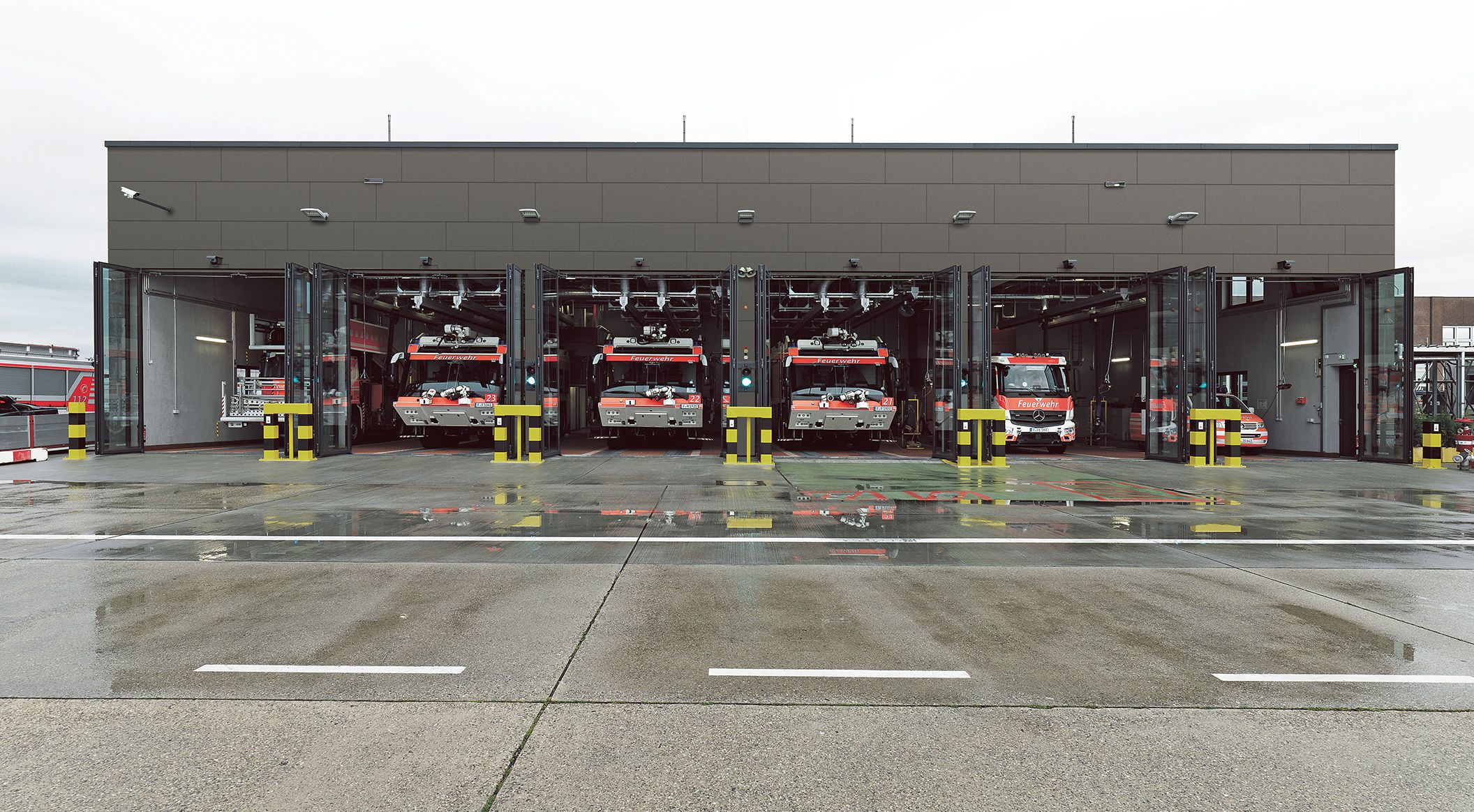 Mit dem Anbau wird die Fläche der Flughafenfeuerwehr am Standort Feuerwache 2 verdoppelt. Die Architekten von in_design haben den Bestand umgebaut, saniert und modernisiert. Im Neubau befindet sich ein zusätzlicher Zug für den Gebäudebrandschutz. Der Flugzeugbrandschutz wurde ebenfalls an die aktuellen Erfordernisse angepasst. Der Komplex befindet sich mitten auf dem Vorfeld des Flughafengeländes, umgeben von Rollbahnen und Flugzeugparkpositionen. Das Team der Feuerwache ist rund um die Uhr im Einsatz, das fand auch bei der Gebäudeplanung Berücksichtigung. Neben Fahrzeughallen, Verwaltungsräumen, Werkstätten, Büros und Besprechungs-, Ruhe- und Schulungsräumen finden auch Küchen- und Speiseräume im Gebäude Platz. Große verglaste Tore öffnen die Fahrzeughallen, horizontale Fensterbänder unterstreichen die Bewegung des Ausrückens. Für die Fassade wurden concrete skin Elemente in chrome und liquid black verwendet. Der Werkstoff Glasfaserbeton garantiert absolute Sicherheit und Brandbeständigkeit durch seine hervorragenden thermischen Werte und ist somit die perfekte Verkleidung für die Feuerwache. Fotos: Ditz Fejer
