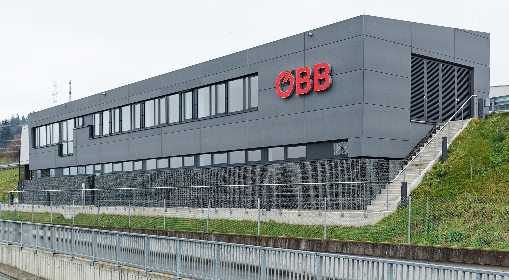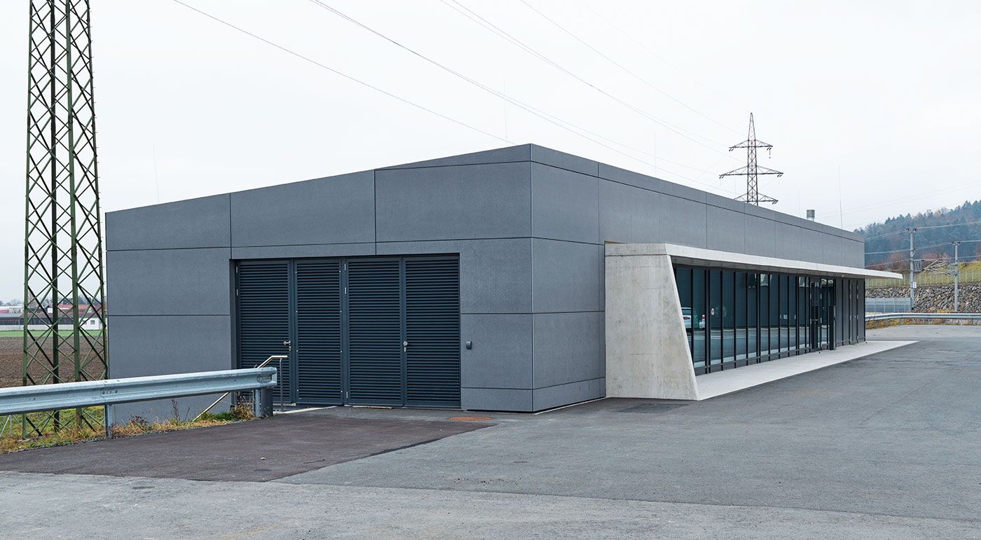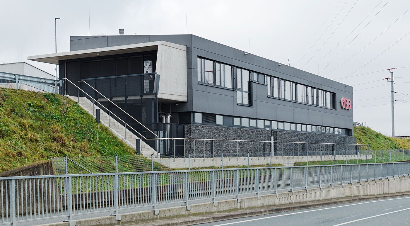 Das Anlagen Service Center der Koralmbahn wurde mit Fassadenelementen von Rieder ausgestattet. Über 800 m² concrete skin Platten kamen zum Einsatz. Als zentraler Servicestandort erfüllt das Gebäude wichtige betriebliche Funktionen. Die langlebige Fassadenlösung unterstützt nicht nur die effiziente Nutzung, sondern trägt auch zur einheitlichen architektonischen Gestaltung entlang der Südstrecke bei. So fügt sich das Service Center nahtlos in das Gesamtkonzept der Koralmbahn ein. Fotos: Ditz Fejer