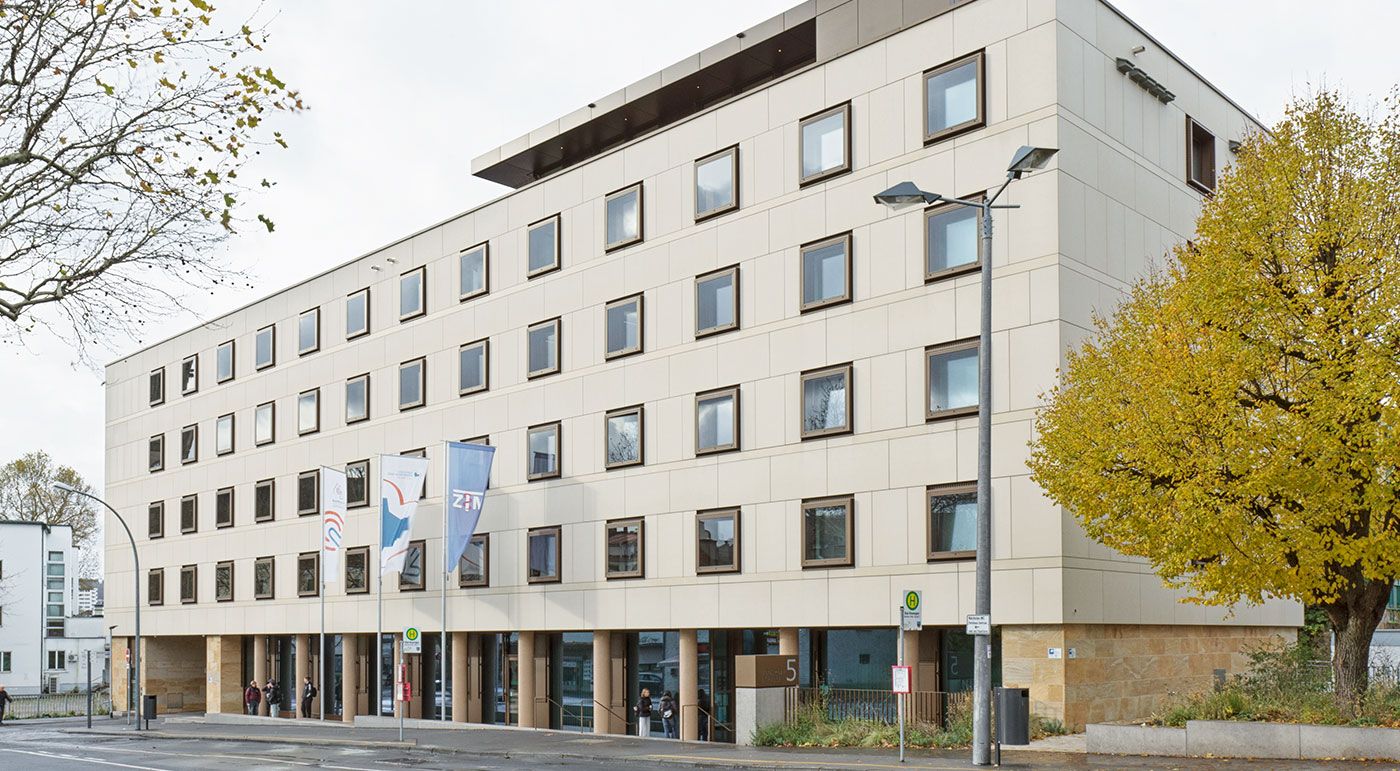 Die modernisierte Fassade setzt auf concrete skin Platten in der Farbe sahara, deren natürliche Optik von den warmen Farbtönen der Natur inspiriert ist. Neben der ästhetischen Aufwertung spielt auch der Naturschutz eine Rolle: Speziell integrierte Nistplätze für Mauersegler bieten den Vögeln dringend benötigten Wohnraum, da in urbanen Gebieten zunehmend geeignete Brutstätten fehlen. Mit dieser Initiative schafft die Stadt Lebensraum für ihre gefiederten Bewohner und leistet einen wertvollen Beitrag zum Artenschutz. Fotos: Ditz Fejer