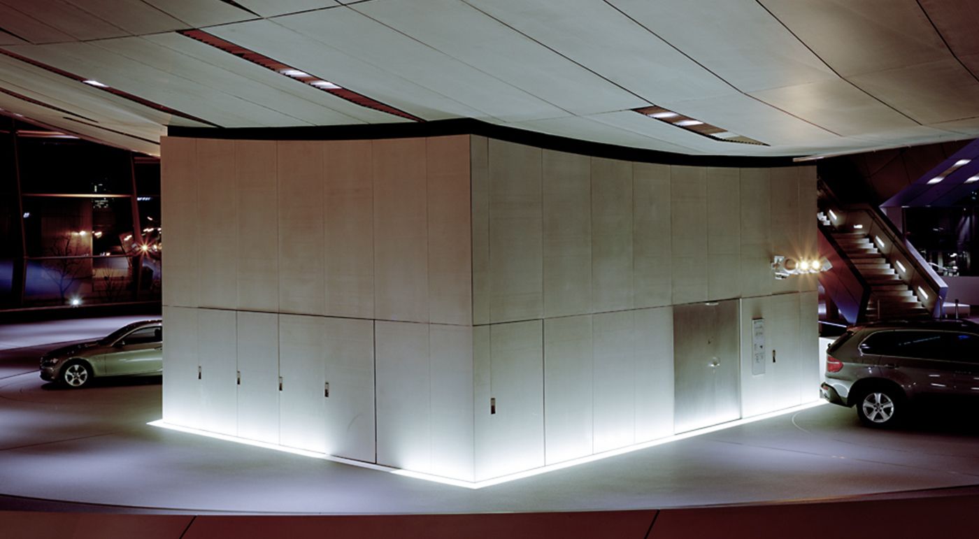 Die Architekten von COOP HIMMELB(L)AU konnten den offenen, internationalen Wettbewerb für sich entscheiden. Ihre zentrale Designidee besteht darin, dass die neue BMW Welt in das optische Bild des BMW Towers und des Museums integriert und dadurch ein identitätsbildendes Ensemble geschaffen wird. Eine große, transparente Halle sowie ein skulpturales Dach stehen im Fokus des Konzepts. Im Innenraum wurden einige Bereiche mit concrete skin Platten verkleidet. Fotos: Rasmus Norlander