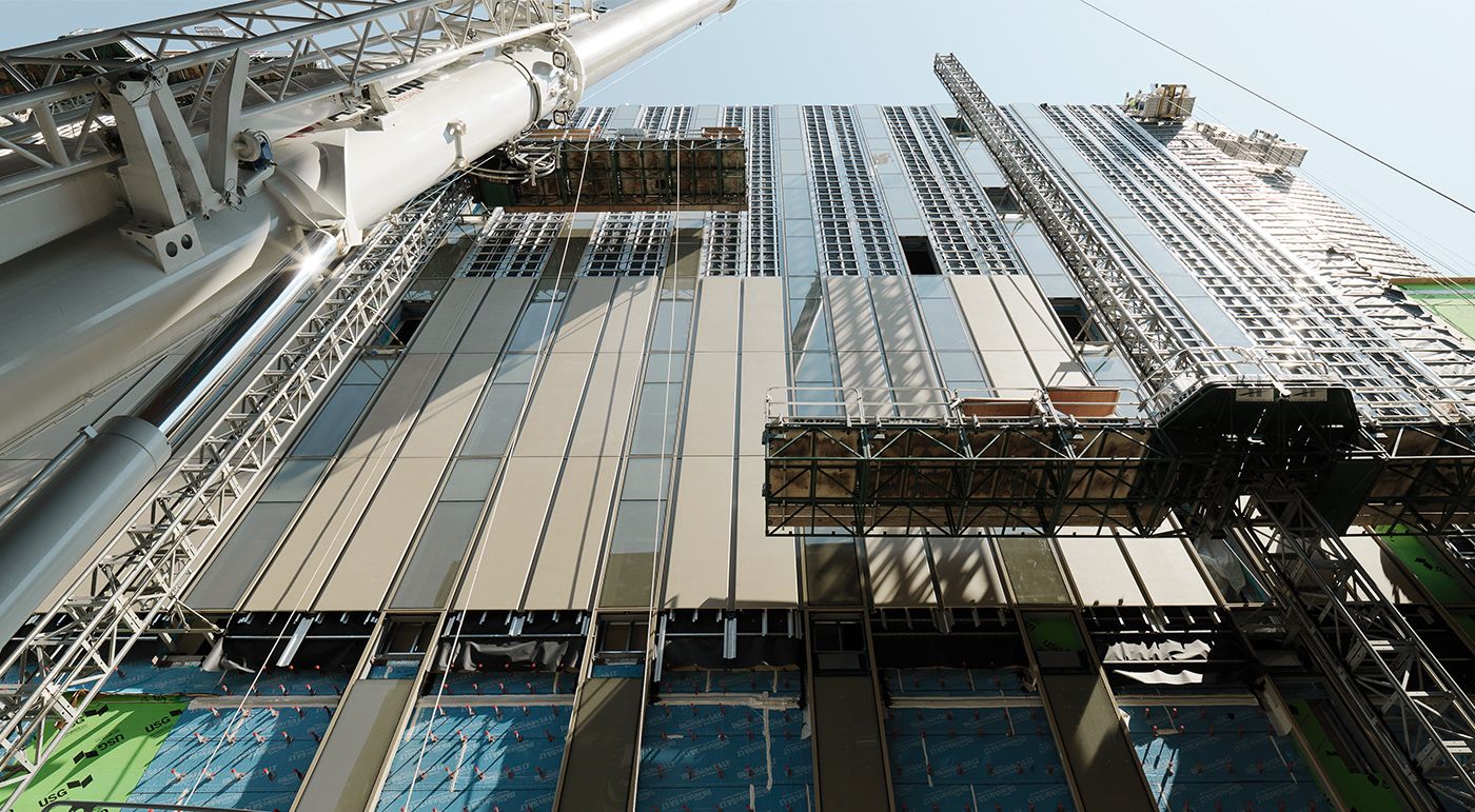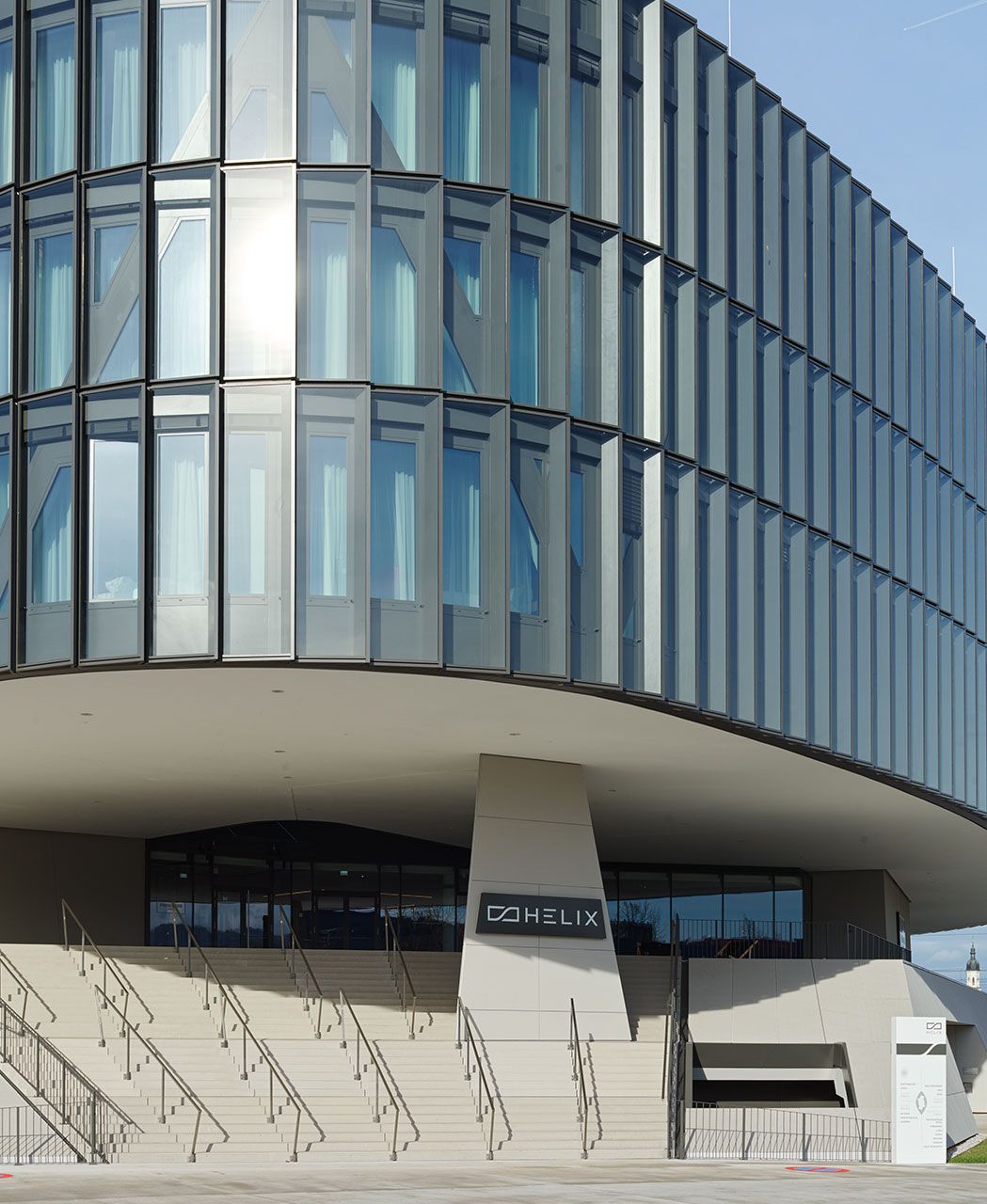 Durch schlanke Betonelemente mit einem integrierten Befestigungssystem ermöglicht Rieder erstmals die Verwendung von Beton für Element-Fassaden. Individuelle Formteile mit U-Querschnitt erzeugen als dünne vertikale Betonlamellen eine Fassade mit gegensätzlichen Typologien. Je nach Betrachtungswinkel wirkt die Fassade durch die herauskragenden Betonlamellen transparent und opak zugleich. Die sandsteinfarbenen Betonelemente fungieren gleichzeitig als Sonnenschutz. Mit der Entwicklung eines eigenen Befestigungssystems machte Rieder die rasche Montage der 1.300 U-Formteile aus Glasfaserbeton möglich. Durch die Vormontage der Befestigungsanker wurde eine schnelle und witterungs-unabhängige Montage bauseits garantiert. Die Formteile wurden einfach an die Unterkonstruktion eingehängt und feinjustiert. Durch das geringe Gewicht der nur 13 mm dünnen Elemente sowie der hohen Spannweiten bis zu 4,25 m war weniger Material an Unterkonstruktion erforderlich. Fotos: Ditz Fejer