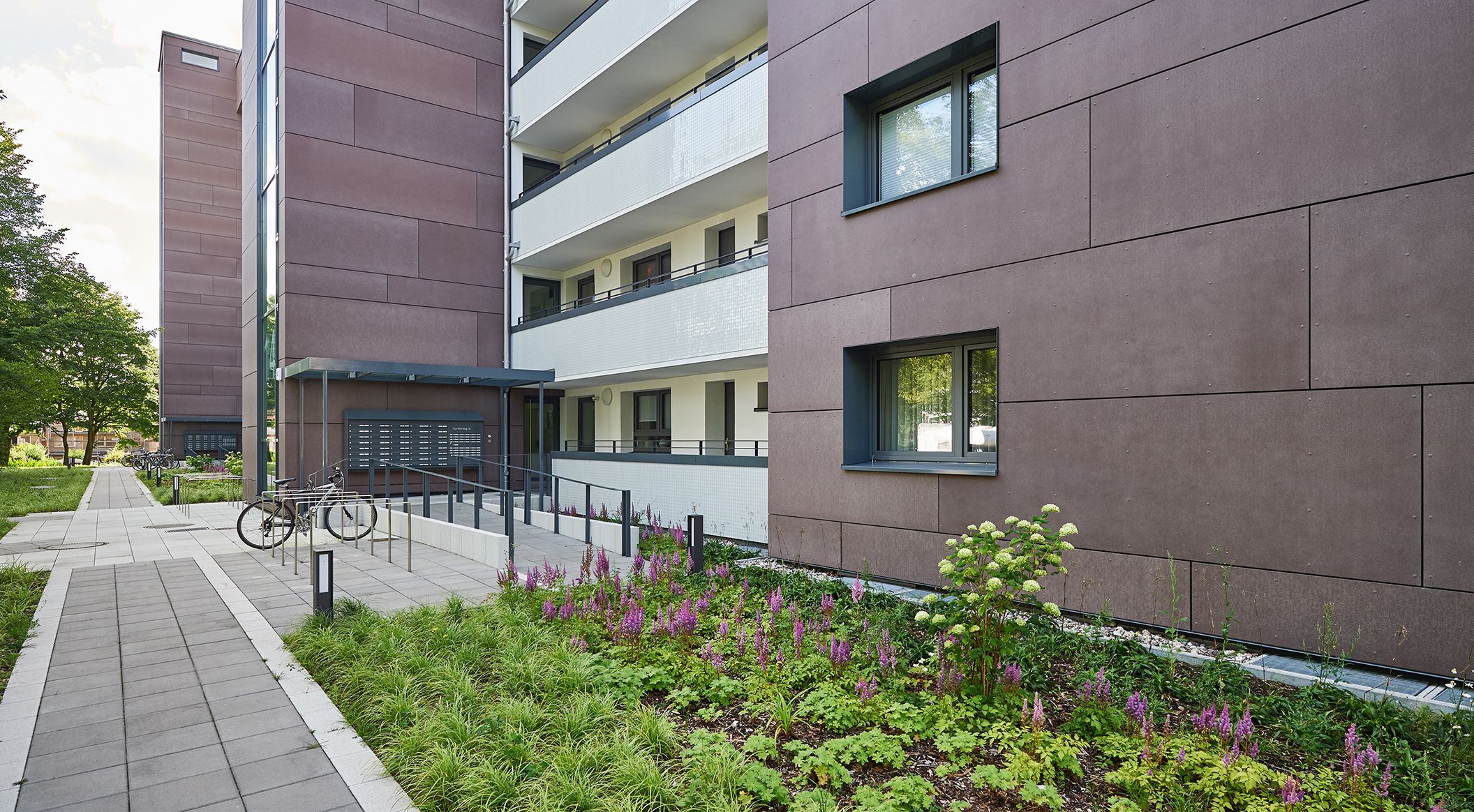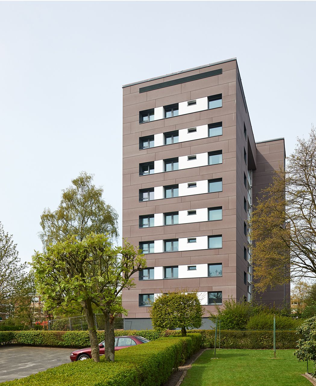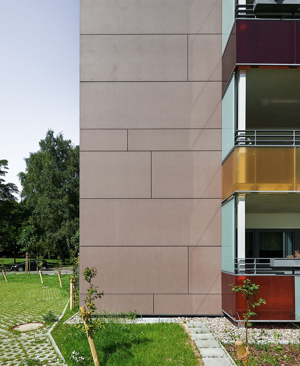 Das alte Backsteingebäude aus den 1960er-Jahren wurde modernisiert und grundlegend energetisch saniert. Damit der Wohnbau mit 80 Wohnungen in das Rotklinker-Ensemble der Umgebung passt, verwendeten die Architekten Glasfaserbeton-Platten in der Farbe terra für die Gebäudehülle. Die Brüstungselemente wurden in wechselnden Farben gestaltet und bieten einen zusätzlichen Blickfang. Fotos: Markus Tollhopf
