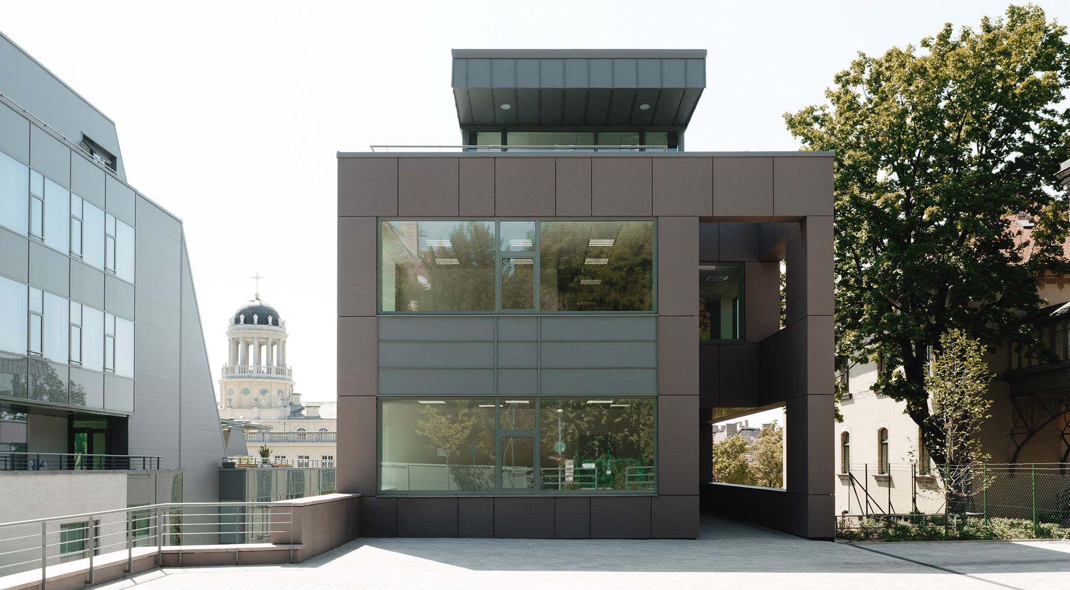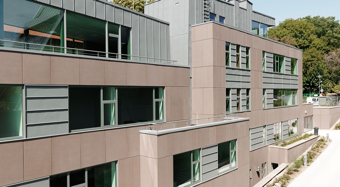 Das ungarische Buda-Cash Brokerhaus wurde mit großformatigen concrete skin Platten in terra verkleidet. Der natürliche Erdton fügt sich harmonisch in die Umgebung ein. Fotos: Ditz Fejer