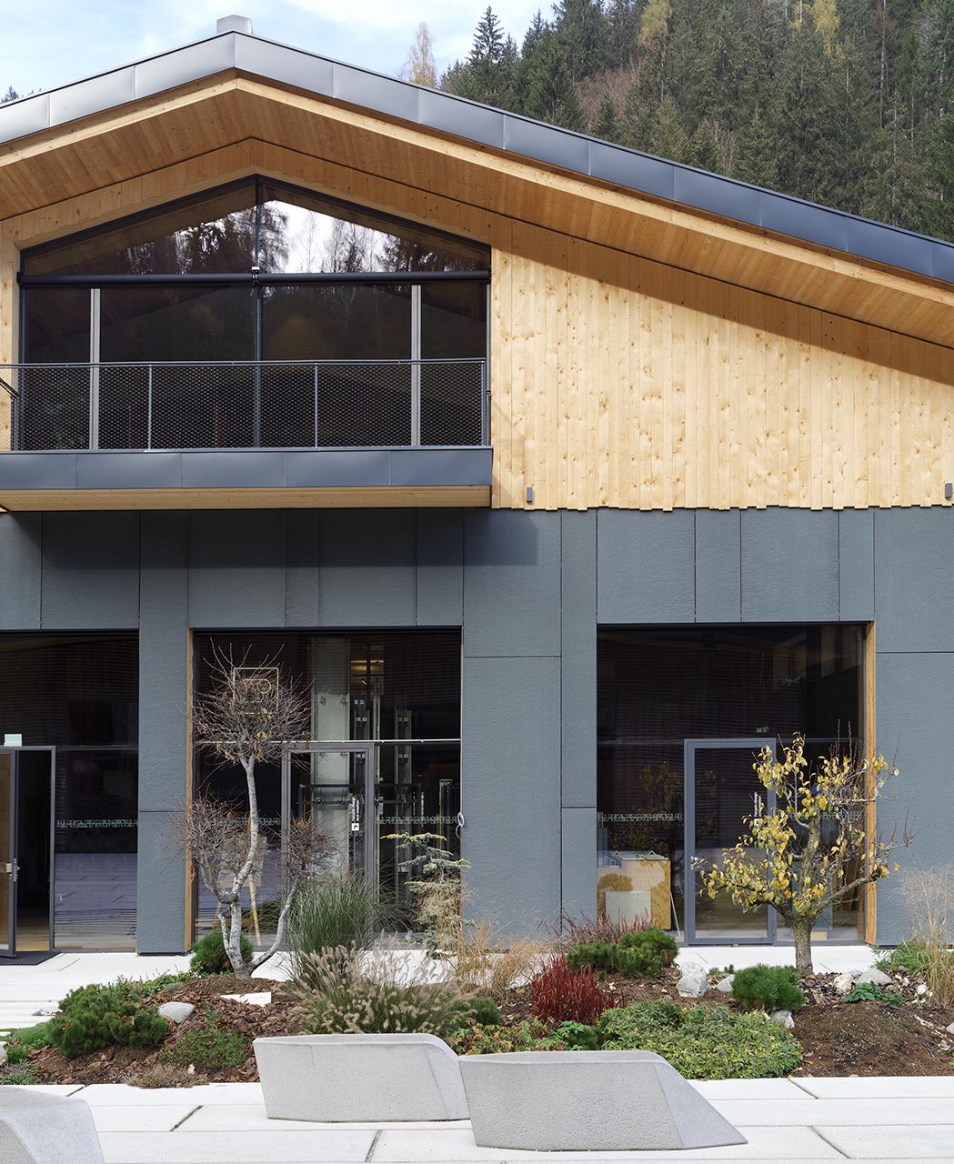 Ein weiteres Highlight ist die Fassade: Rieder entwickelte einen CO2-reduzierten Glasfaserbeton. Die Elemente mit reduziertem Zementanteil umhüllen auf einer Fassadenfläche von 400 m² das neue Headquarter. Die Textur slate in der Farbe pine green erinnert an eine Schieferoptik. 50 Prozent des Zements in der Betonmatrix wurden substituiert, womit eine CO2-Reduktion von 30 Prozent erreicht wurde. Fotos: Ditz Fejer / Rasmus Norlander