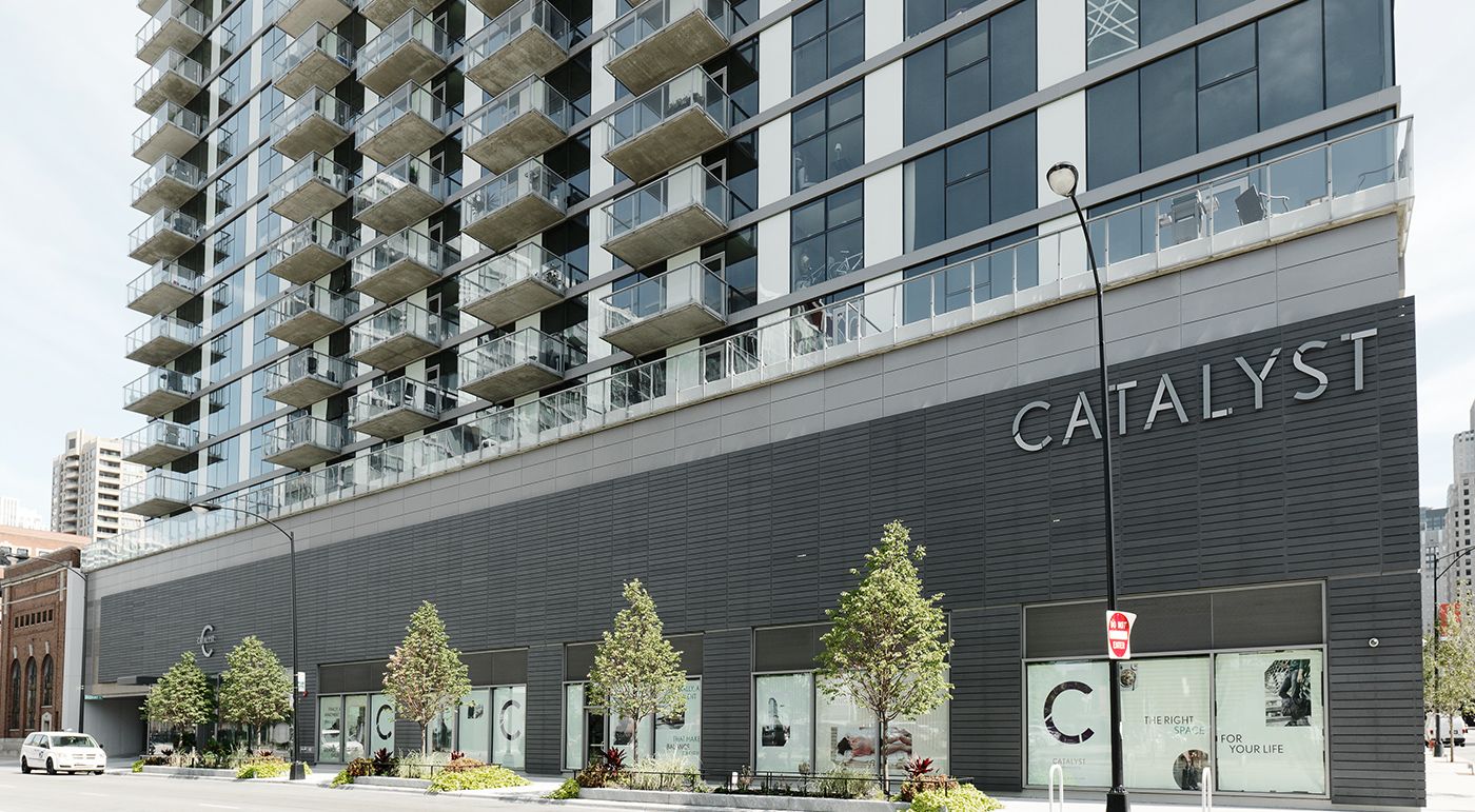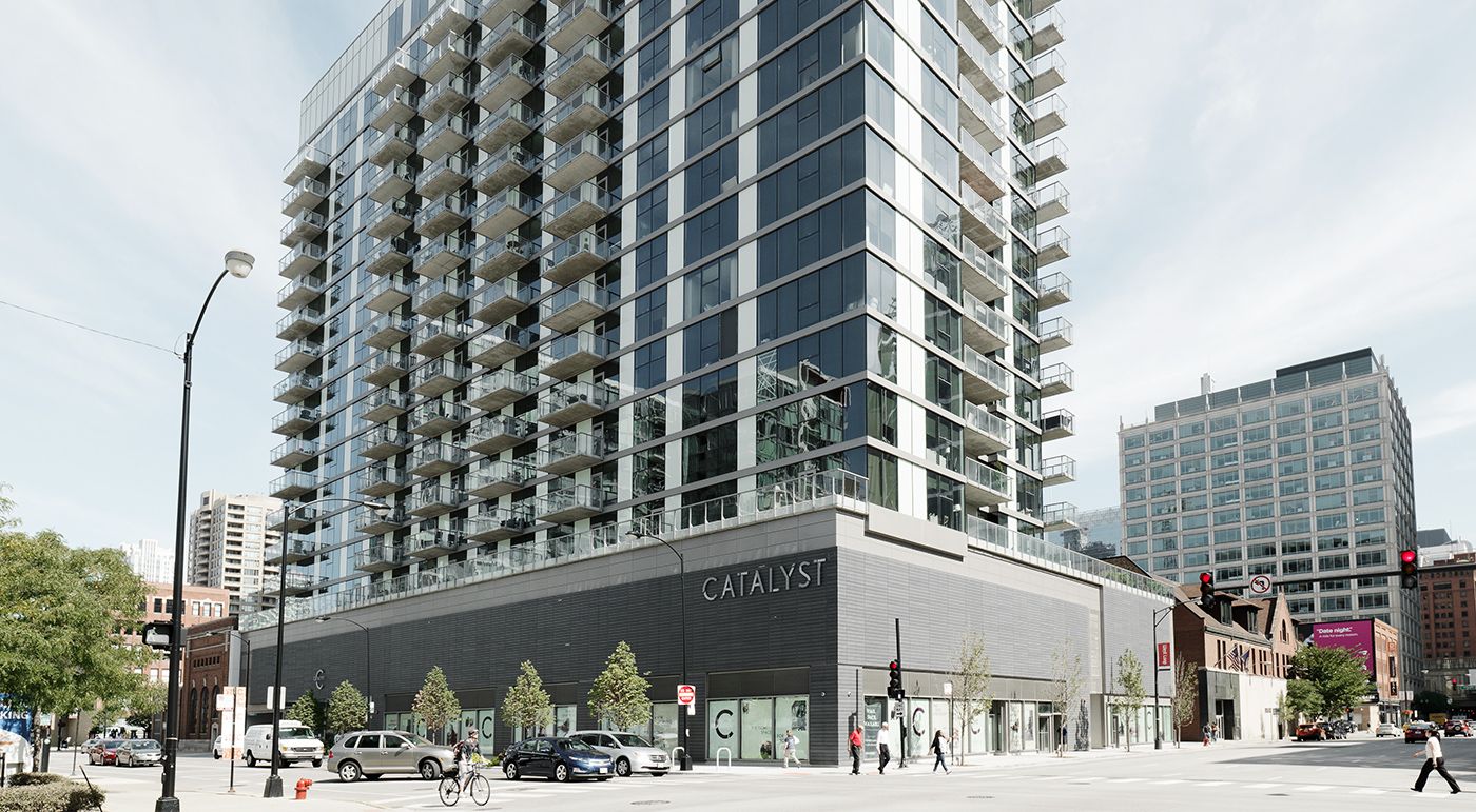 Der Catalyst Tower in Chicago wurde von den Architekten Brininstool + Lynch Ltd. gestaltet. Das Hochhaus umfasst 223 Wohneinheiten und 198 Parkplätze, im Erdgeschoss befinden sich Geschäftsräume. Fotos: Ditz Fejer