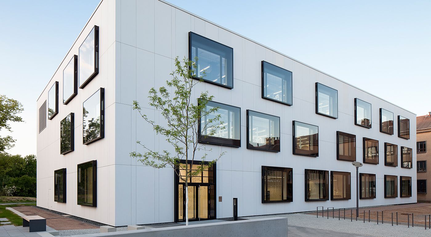 Die vorhandene Hochschule in Freiberg wurde um einen dreigeschossigen Neubau ergänzt. Dieser bietet Platz für alle Labore. Das Gebäude ist durch einen schmalen Verbinder an den Bestand angeschlossen. Für die Fassade verwendeten die Architekten von Code Unique großformatige concrete skin Platten in polar white. Fotos: Sven Otte