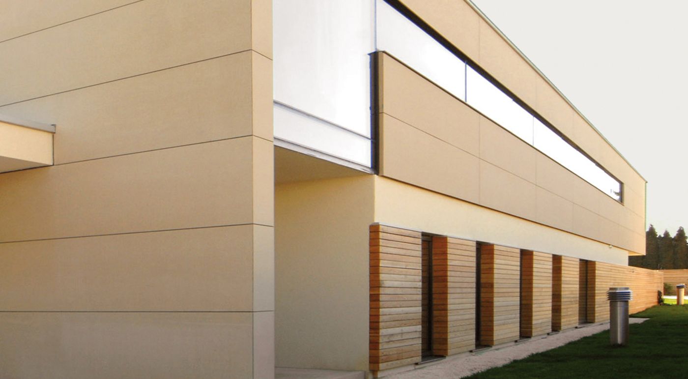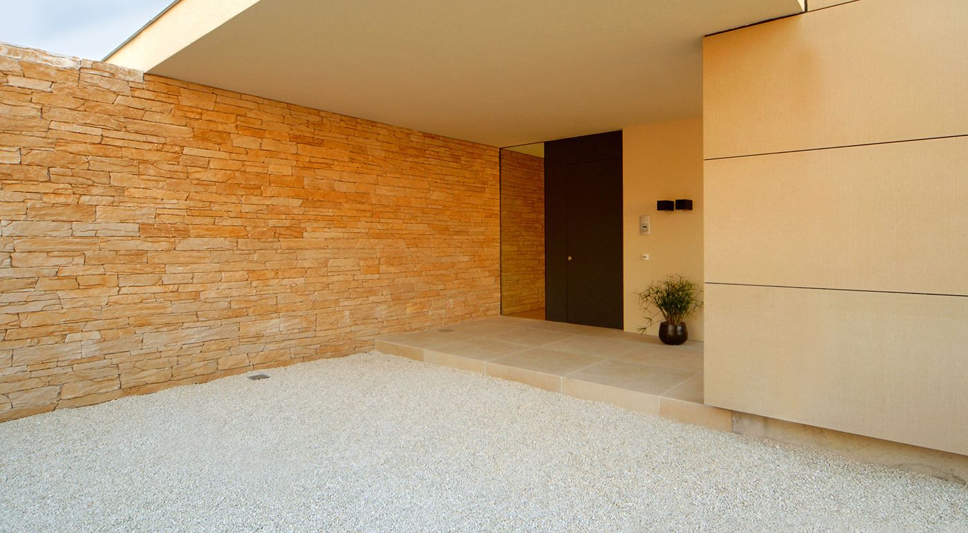 Ein elegantes und aufgeräumtes Layout liegt dem Haus mit 300 m² Wohnfläche zu Grunde. Die Fassade wird durch einen Wechsel zwischen hellen und dunklen Materialien sowie matten und glänzenden Oberflächen geprägt. Die Kombination von concrete skin Platten, Naturstein, Lärchenholz und beigefarbenem Putz setzt harmonische Akzente. Im Innenraum liegt der Fokus auf dunklen Farben, wie zum Beispiel schwarzes Acrylglas. Fotos: AW Architekten