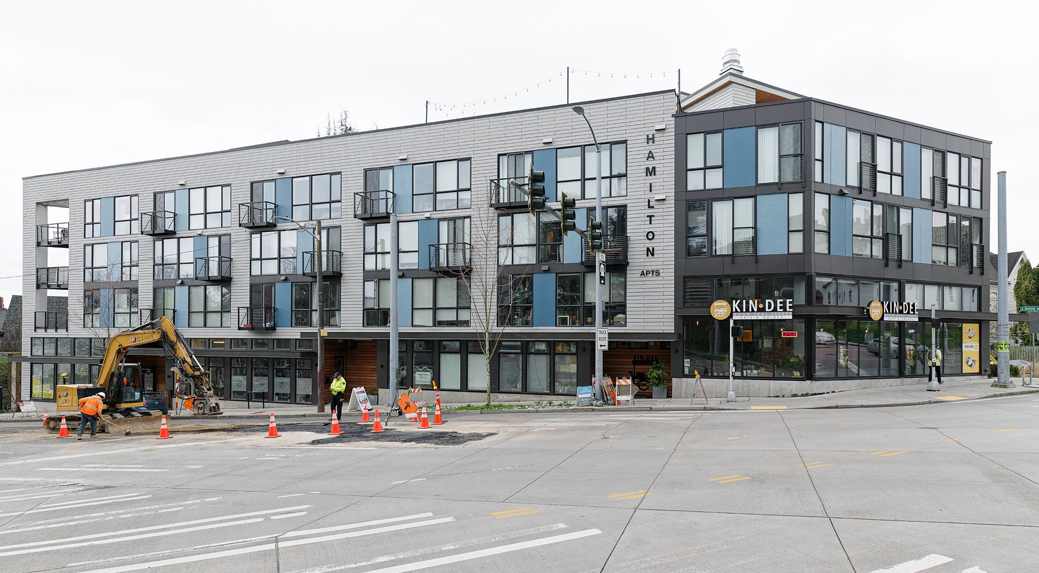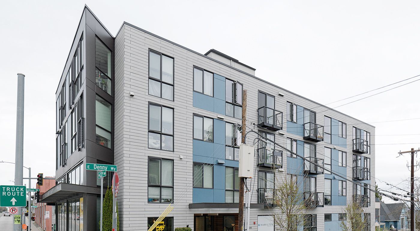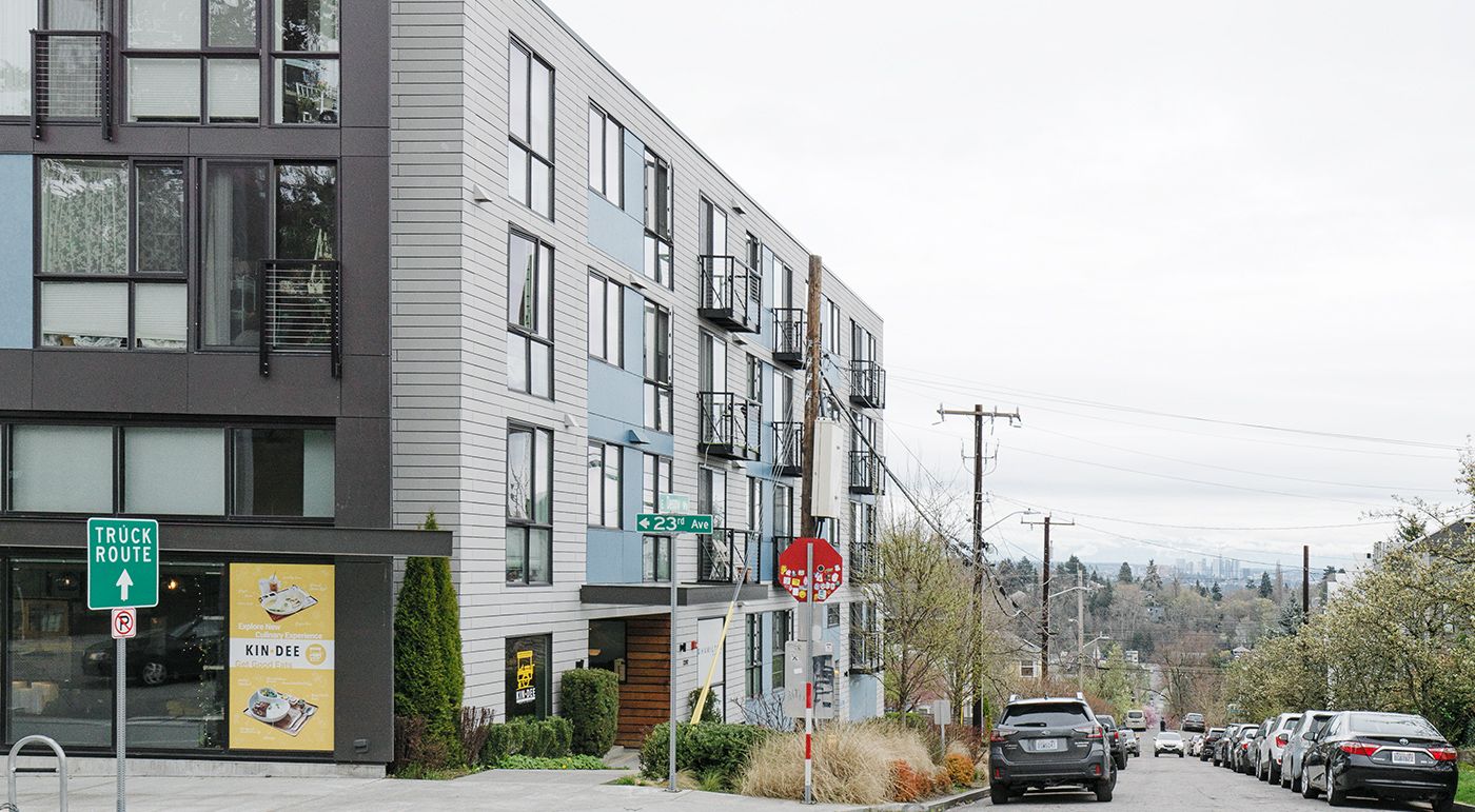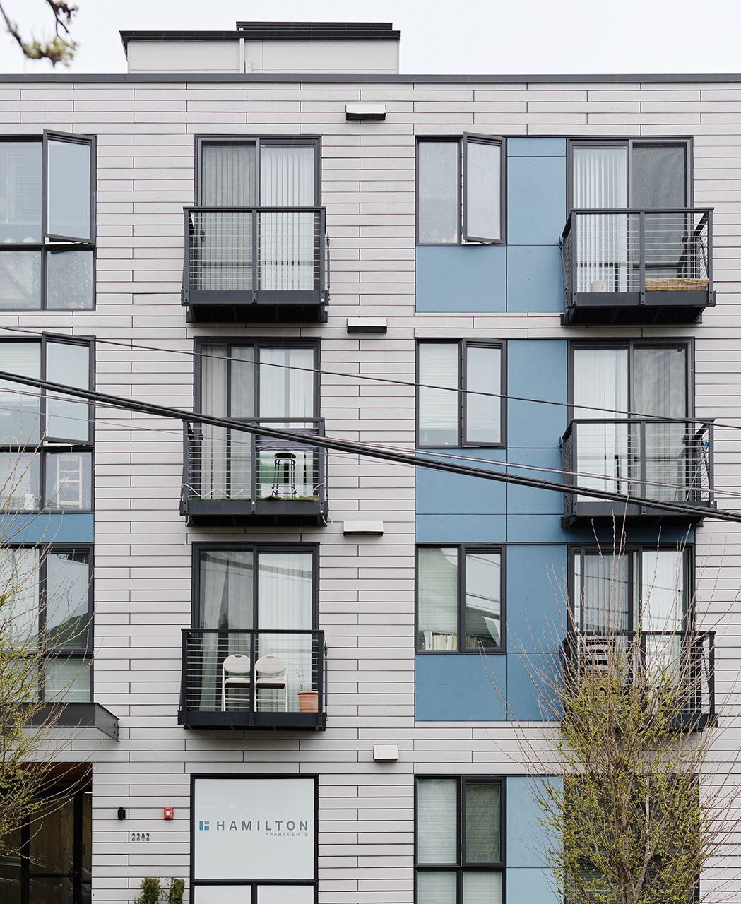 Der Komplex bietet großzügige Wohn- und Geschäftsflächen, welche auf die örtlichen Bedürfnisse zugeschnitten sind. Die Fassadengestaltung zeichnet sich durch große Fensterfronten, hervorstehende Markisen und einer gewissen Asymmetrie aus. Die Gebäudehülle wurde mit öko skin Latten verkleidet, welche sich sich harmonisch in das Gesamtkonzept einfügen. Fotos: Ditz Fejer