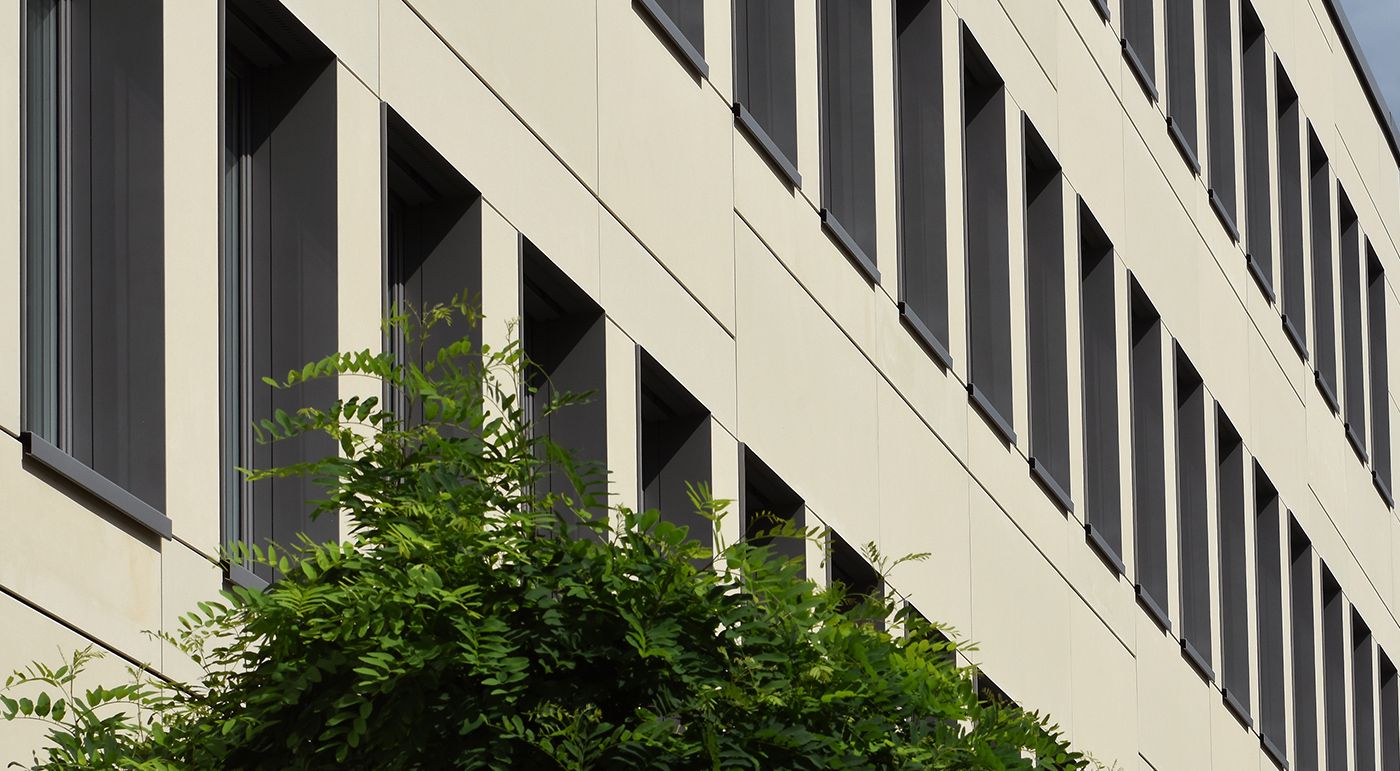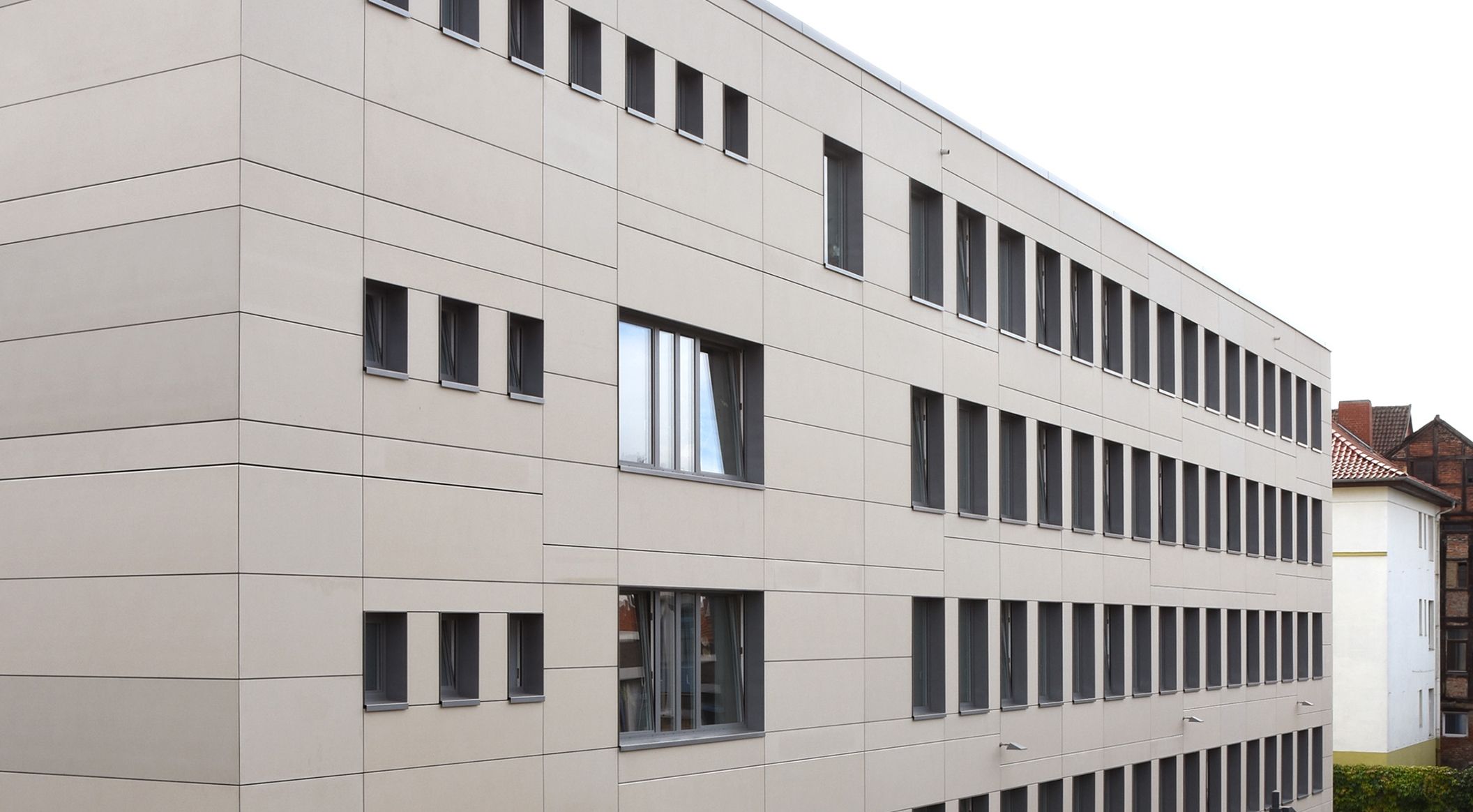 Der Anbau des Hauses kirchlicher Dienste in Hannover wurde energetisch saniert, nun können 40% CO₂-Emissionen eingespart werden. Für die Fassade verwendete der Architekt Sven Becker concrete skin Platten in der Farbe sahara. Fotos: Ulrich Ahrensmeier