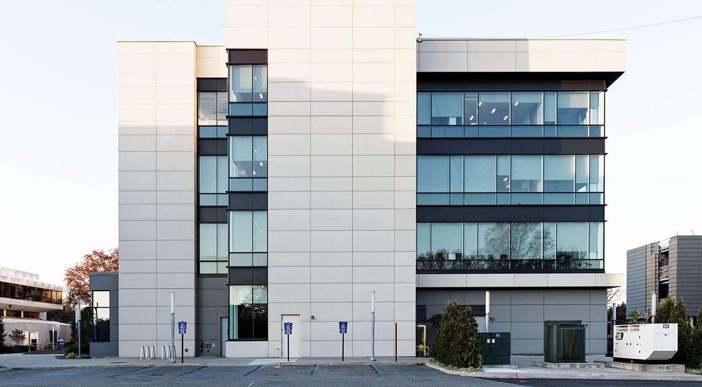 Die Hofstra University erhielt ein neues, hochmodernes Bürogebäude, welches harmonisch in den Campus integriert wurde. Um die Interaktion innerhalb der Fakultät zu fördern, kam eine verbindende Fußgängerbrücke zum Einsatz. Die Außenhaut wurde mit concrete skin Platten in chrome und sahara verkleidet. Die Glasfaserbeton-Elemente konnten die Architekten durch ihre nicht brennbaren, langlebigen und nachhaltigen Eigenschaften überzeugen. Fotos: Ditz Fejer
