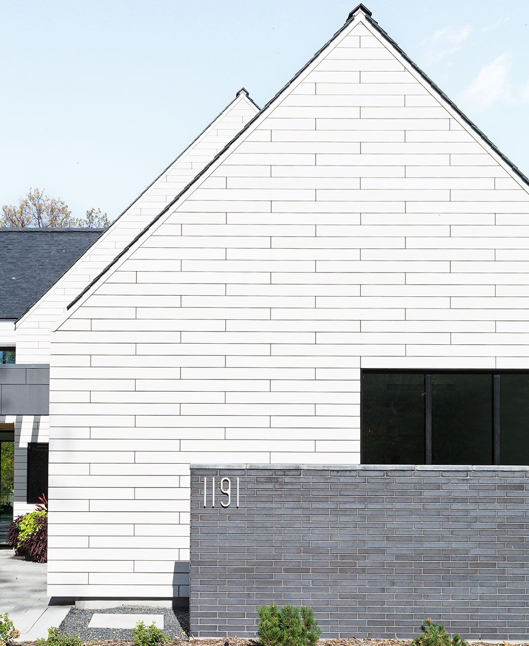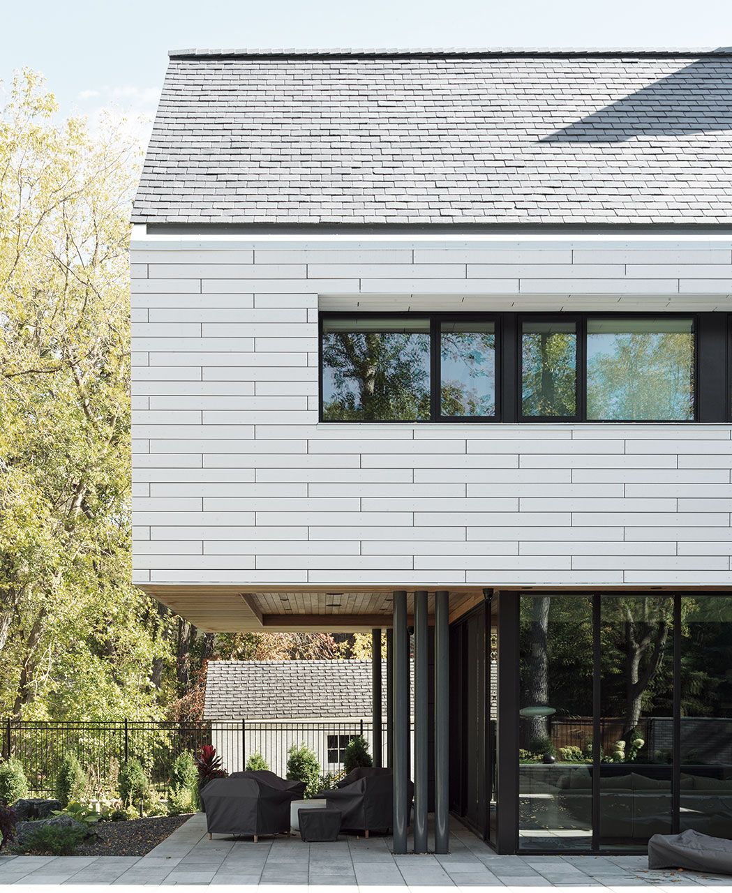 Ein Privathaus in Kanada wurde mit über 800 m² öko skin Latten in polar white verkleidet. In Verbindung mit dem dunklen Erdgeschoss und Dach entsteht ein spannender Kontrast an der Gebäudehülle. Die spitze Dachform und großzügigen Fensterflächen tragen ebenfalls zur besonderen Erscheinung bei. Fotos: Ditz Fejer