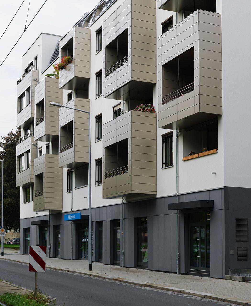 Prächtige Fassaden aus Gründerzeitbauten prägen den Münchner Platz in Dresden bis heute und verleihen dem Quartier seinen besonderen Charme. Die akzentuierte Gebäudehülle des neuen Wohnkomplexes „mzwei“ fügt sich harmonisch in das Gesamtbild ein. concrete skin Platten und scharfkantige formparts in anthracite wurden für den unteren Bereich verwendet. Die dunklen Elemente bieten einen spannenden Kontrast zu der ansonsten hellen Fassade.