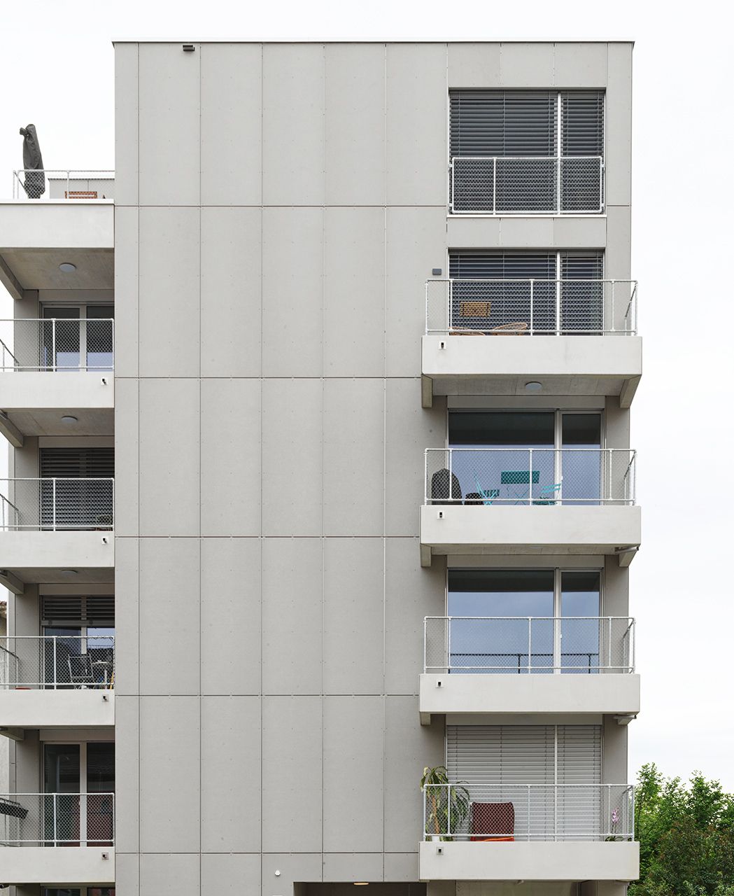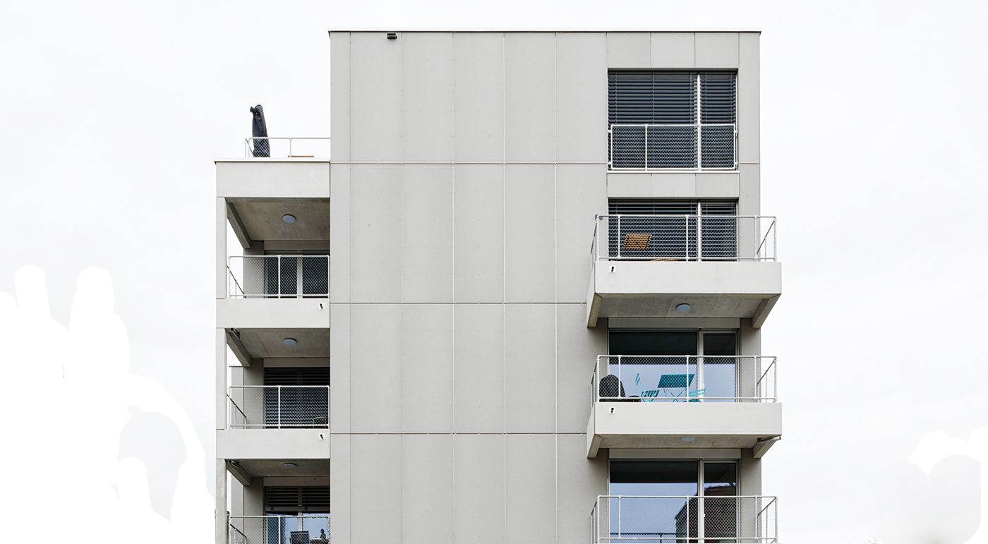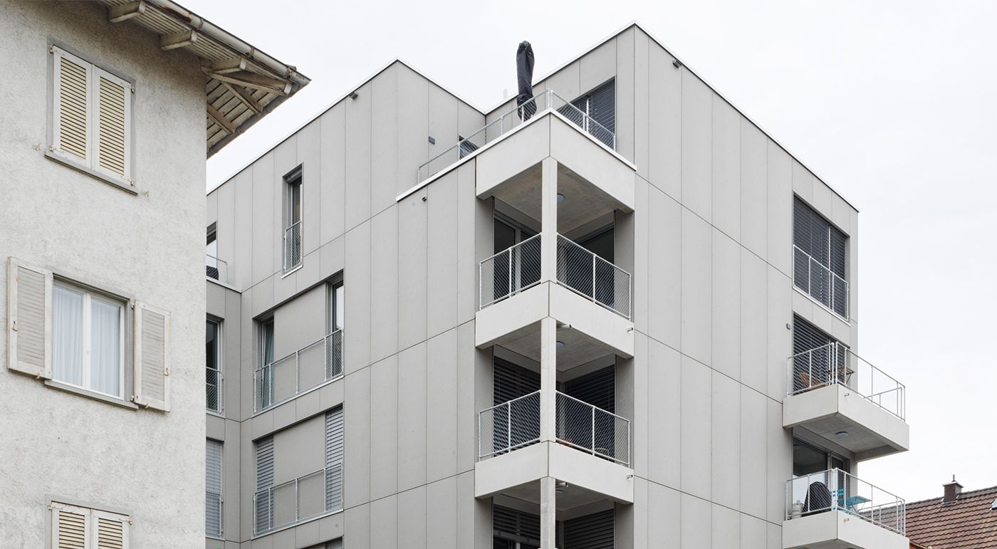 Der Neubau bietet Platz für 16 Mietwohnungen, welche vorwiegend auf Studenten ausgerichtet sind. Das verschachtelte und kubische Gebäudevolumen ermöglicht eine innere Verdichtung und schafft dadurch möglichst viel Platz. Bei der Materialwahl stand Beständigkeit im Vordergrund, daher ist Beton sowohl an der Gebäudehülle als auch im Innenbereich ein prägendes Element. Die Platten aus Glasfaserbeton passen hervorragend in das Konzept und ermöglichen eine langlebige und robuste Fassadenlösung. Fotos: Ditz Fejer