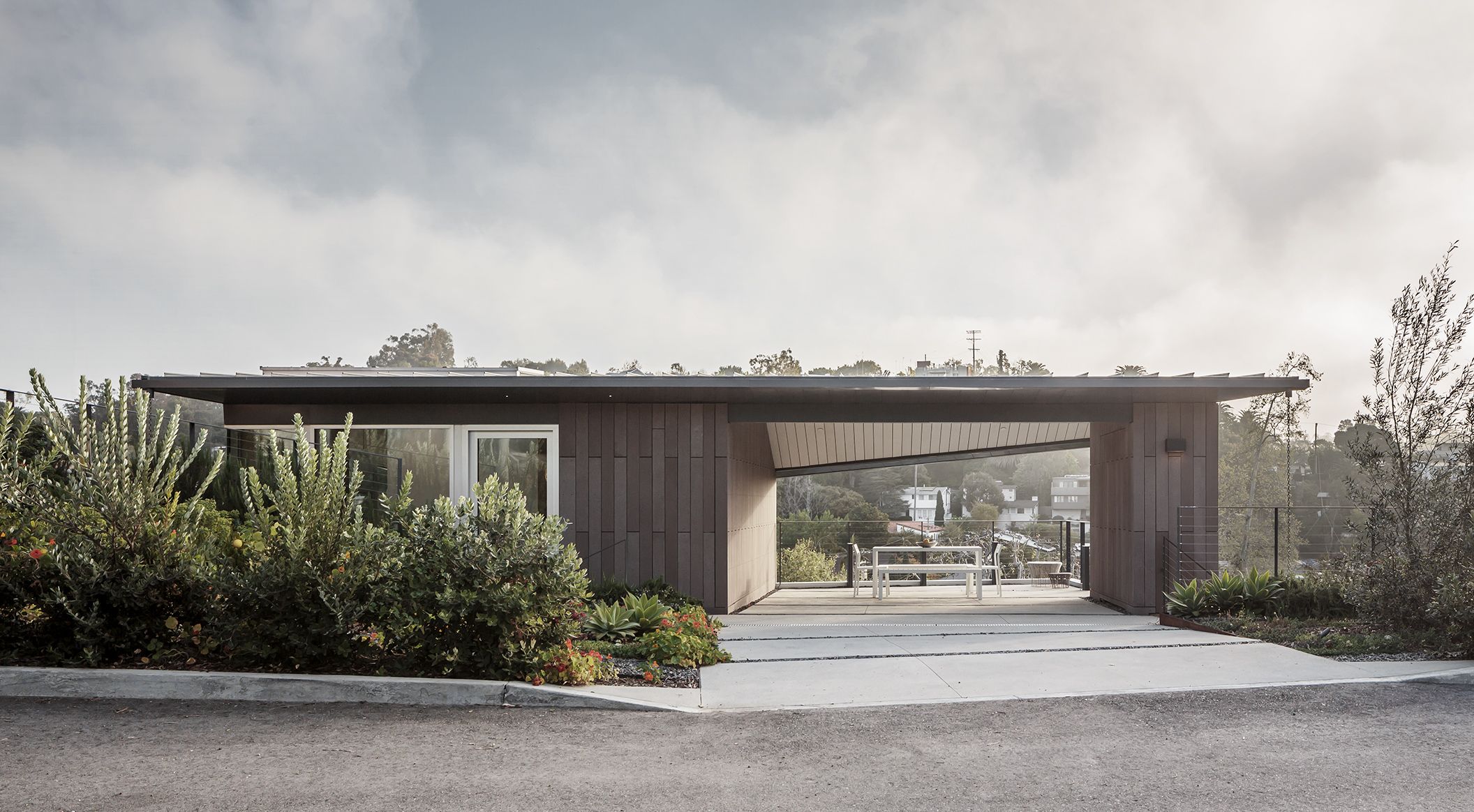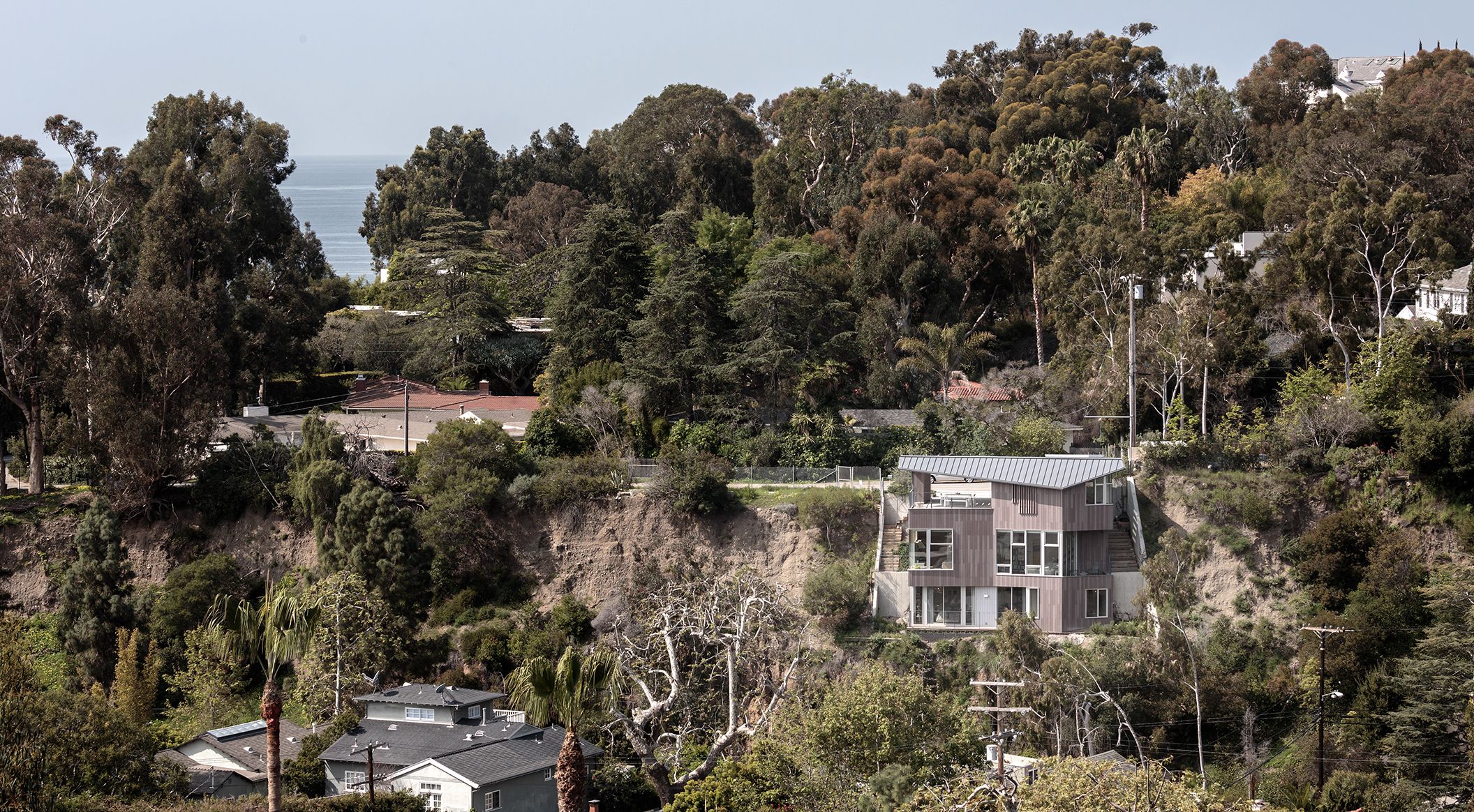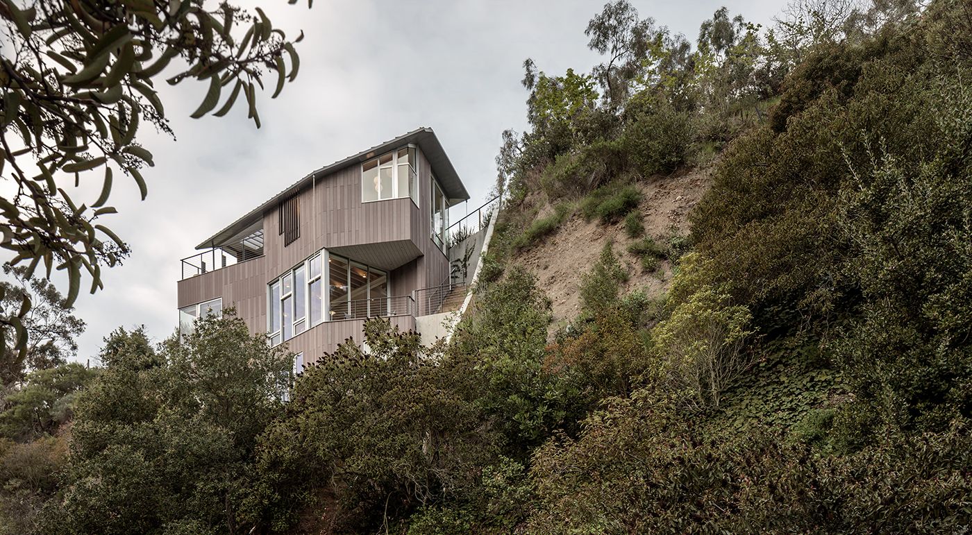 Jaenne Chen und Bob Dolbinski, beide Architekten bei Moore Ruble Yudell, waren lange Zeit auf der Suche nach dem geeigneten Grundstück für ihr Privathaus. Rustic Canyon ist eine ländliche Oase in den Hügeln zwischen Santa Monica und den Pacific Palisades in Kalifornien. Dort fanden die beiden ein großes, aber sehr steiles Grundstück. Die Architekten haben das dreistöckige Haus clever in die Klippe hineingebaut. Sie entschieden sich für öko skin Latten, da sie nicht brennbar sind und dadurch einen Schutz des Hauses in dem brandgefährdeten Gebiet bieten. Außerdem fügt sich der natürliche Farbton perfekt in die Umgebung und die Natur ein. Fotos: moorerubleyudell & colins_lozada