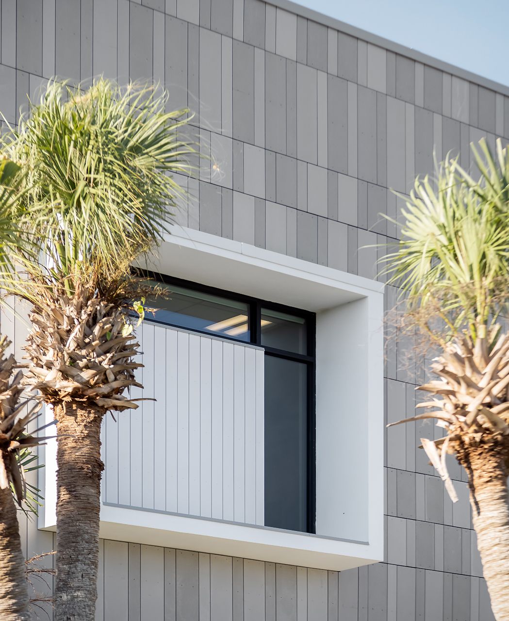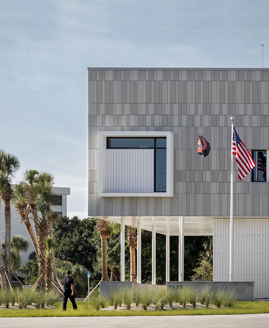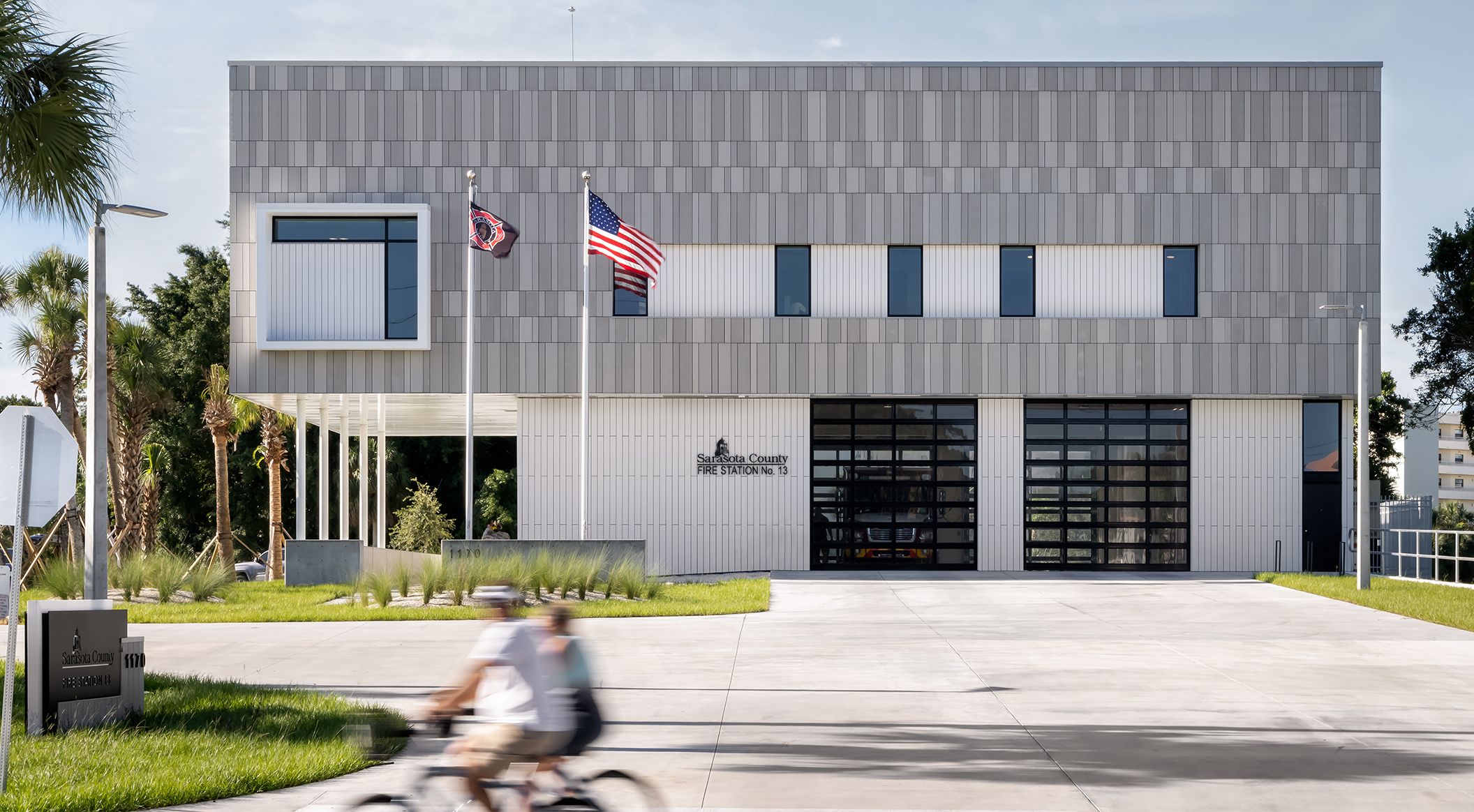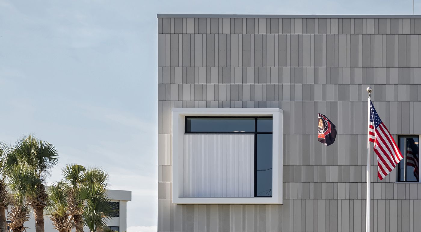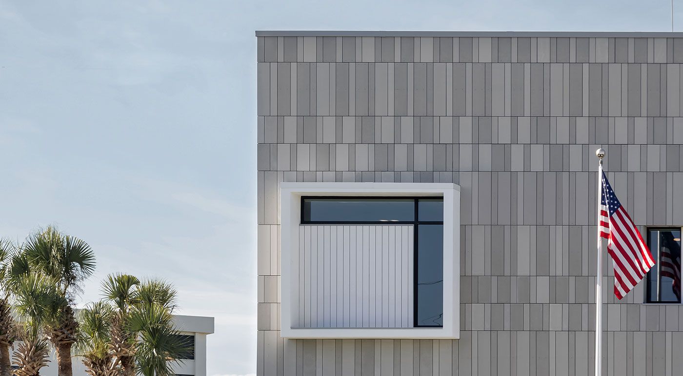 Die Sarasota Firestation #13 in Florida wurde mit öko skin Latten in silvergrey, polar white und ivory verkleidet. Die Farben nehmen Bezug auf den hellen Quarzsand des Siesta Key Public Beachs. Glasfaserbeton garantiert absolute Sicherheit und Brandbeständigkeit durch seine hervorragenden thermischen Werte und ist somit die perfekte Verkleidung für die Feuerwache. Fotos: Ryan Gamma