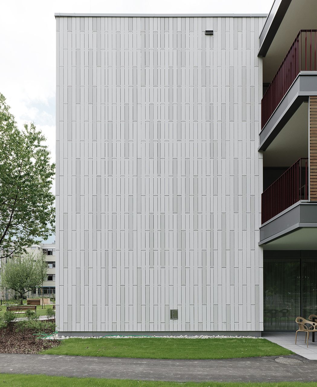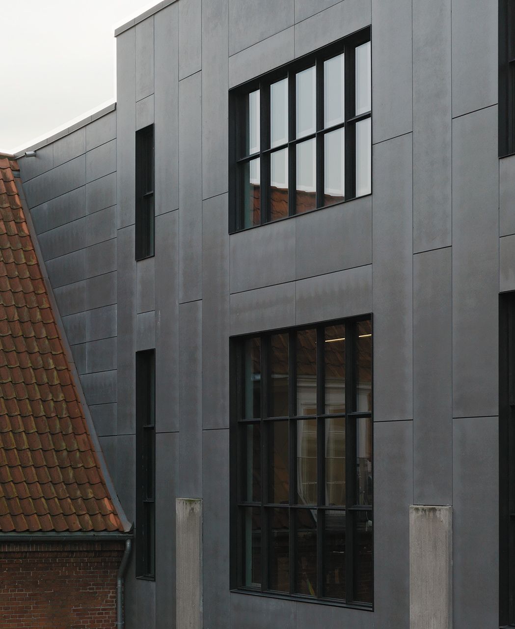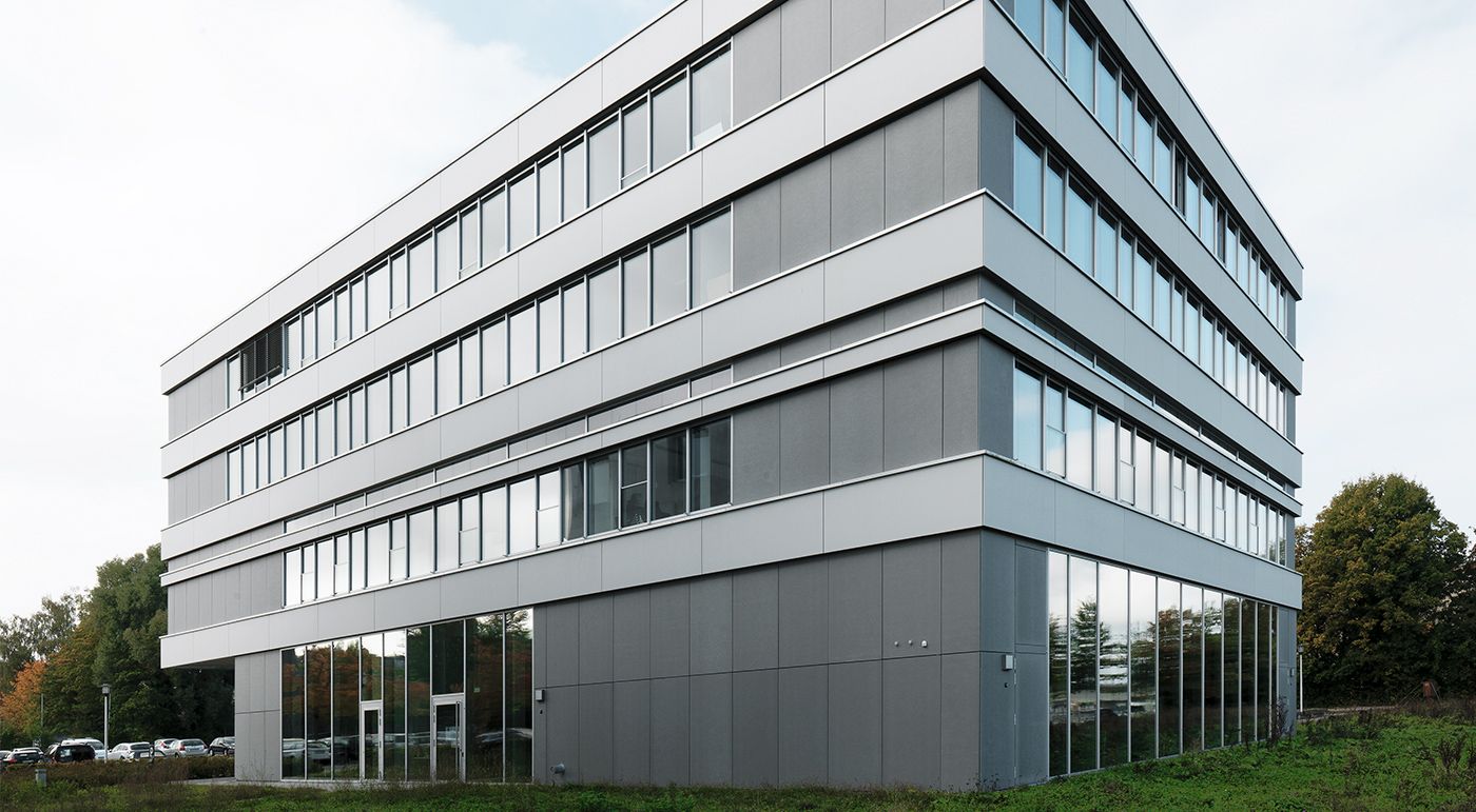 Die Gebäudehülle wurde als Bandfassade ausgeführt. Die vorgehängten concrete skin Platten aus Glasfaserbeton nehmen die Oberfläche und Optik des Sichtbetons vom Nachbargebäude auf und schaffen eine harmonische Verbindung. Die horizontalen Bänder ziehen sich im Hell-Dunkel-Kontrast über die Fassade, dadurch entsteht eine spannende Optik. Durch das Spiel mit Licht und Schatten werden individuelle Highlights gesetzt. Fotos: Ditz Fejer