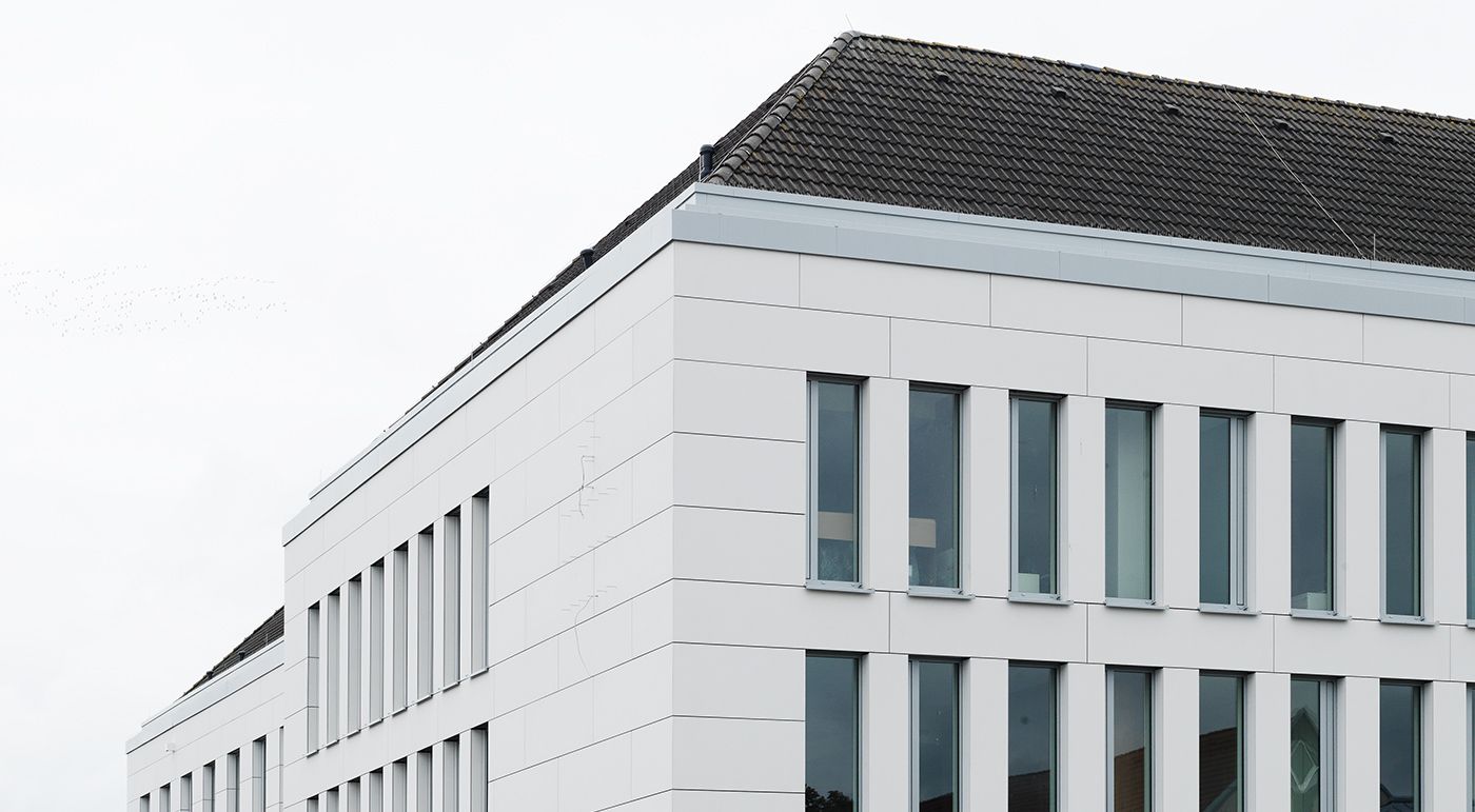 Die Sparkasse Iserlohn wurde saniert und revitalisiert. Die Modernisierung der Bank war der erste Schritt zur Neugestaltung des gesamten Areals rund um den Schillerplatz. Während Chapman Taylor für die Gestaltung des Gebäudes zuständig waren, entwarfen die Architekten von BKP die Innenräume. Das neue Design schafft einen markanten, zeitgemäßen Komplex, welcher sich harmonisch in den städtebaulichen Kontext einfügt und für ein attraktives Umfeld sorgt. Die Fassade wurde mit concrete skin Platten in polar white und silvergrey verkleidet. Ein 400-Quadratmeter-Glasdach über der Kundenhalle bringt genügend Sonnenlicht in die Räume und verleiht der Bank eine außergewöhnliche Note. Fotos: Ditz Fejer