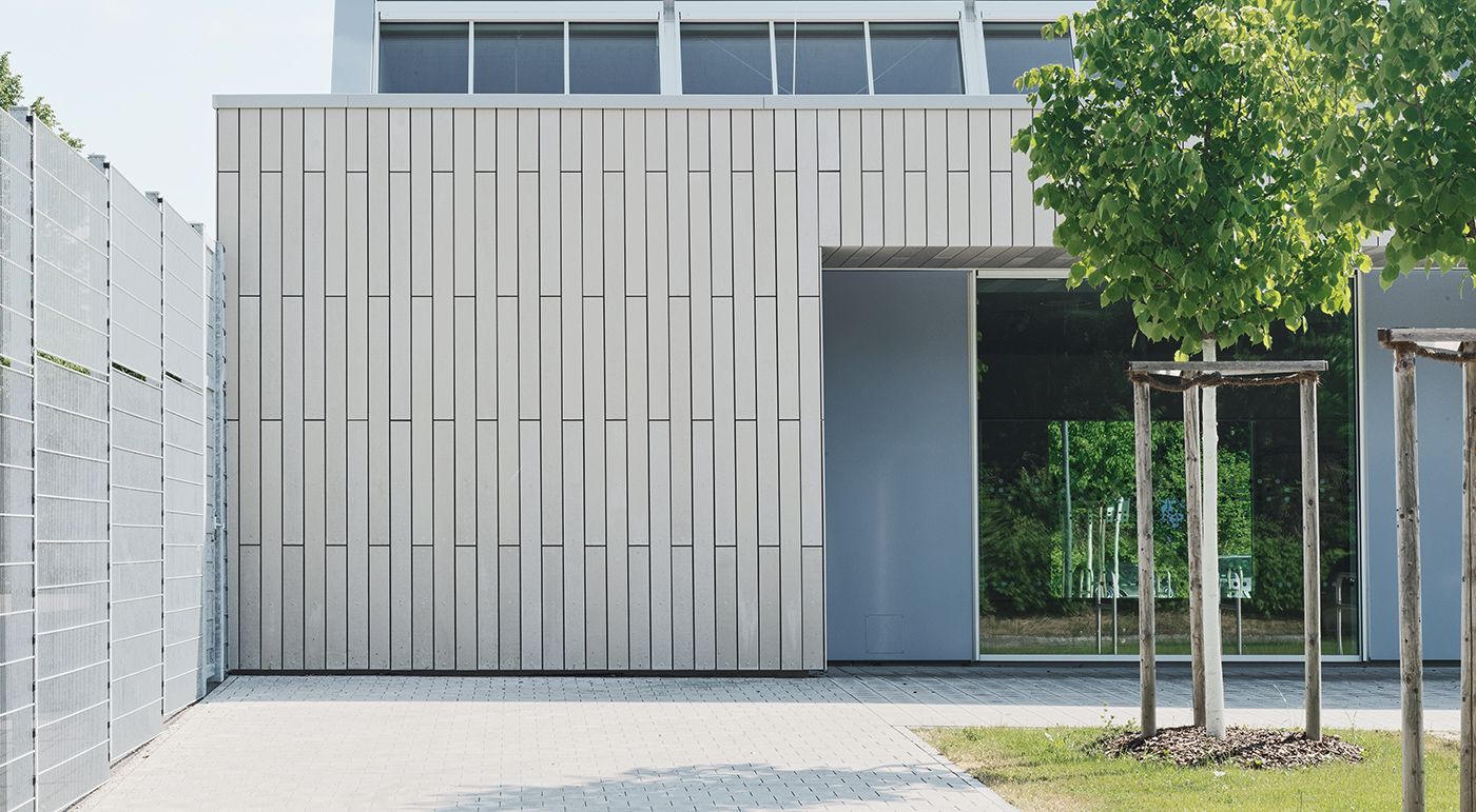 Die 45×22 Meter große, in den Boden versenkte Sporthalle kann durch elektrische Trennvorhänge in drei gleichgroße Teile getrennt werden. Zudem gibt es Gymnastikräume für Kleinsportgruppen, wie zum Beispiel Yoga oder Karate. Im Bereich der Tribüne stehen Sitz- und Stehplätze für 130 Personen zur Verfügung. Für die Fassade verwendeten die Architekten von Fuchs und Rudolph hellbeige Latten aus Glasfaserbeton. Dazwischen finden sich blaue und rote Metallpaneele aus pulverbeschichteten Aluminiumblechen, welche farbliche Akzente setzen. Große Glasflächen bringen genügend Tageslicht ins Innere. Fotos: Ditz Fejer