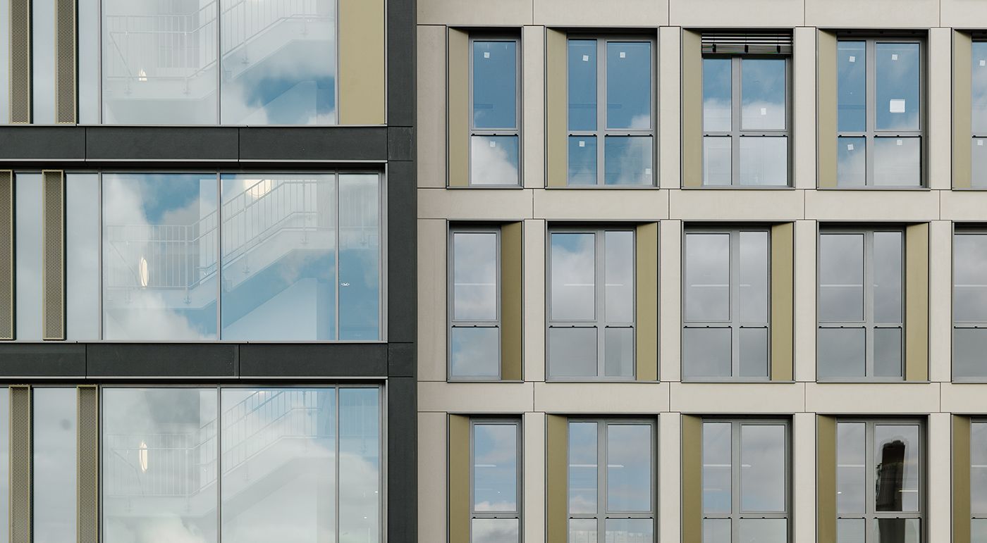 Auch der nachhaltige Gedanke beschäftigte die Architekten bei der Planung der Neubauten. Städtische Brachflächen werden revitalisiert, modernste Energie-Standards und langlebige Gebäudekonzepte werden umgesetzt. Passend zu dem ökologischen Gedanken wurde das erste Bürogebäude mit concrete skin Platten in liquid black und sahara verkleidet. Neben dem Hell-Dunkel-Kontrast bietet die Fassade mit der Textur luce silver ein weiteres Highlight: Durch einen Glimmer-Zusatz erhält die Gebäudehülle eine glitzernde und schimmernde Optik. Je nach Sonneneinfall werden die Partikel unterschiedlich reflektiert und sorgen für einzigartige Effekte. Fotos: Ditz Fejer