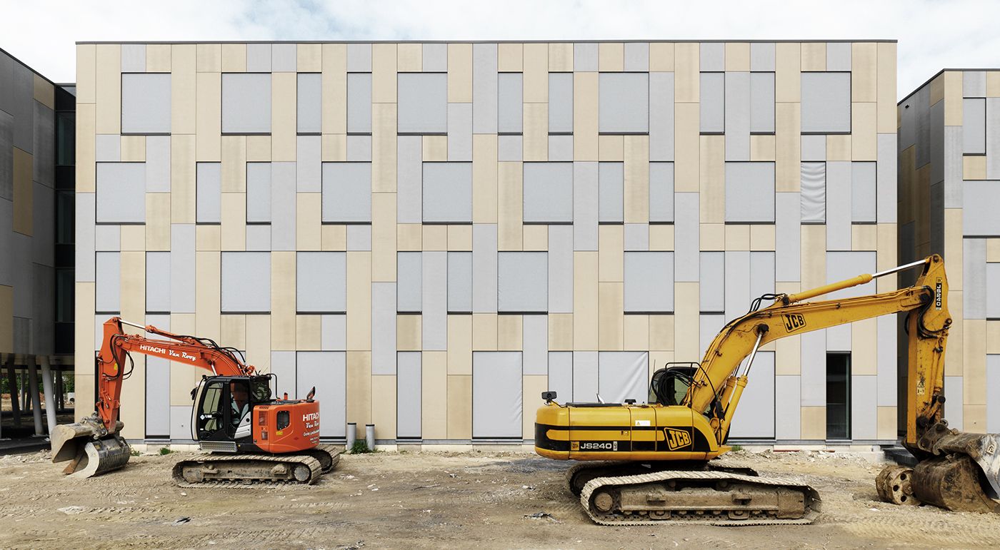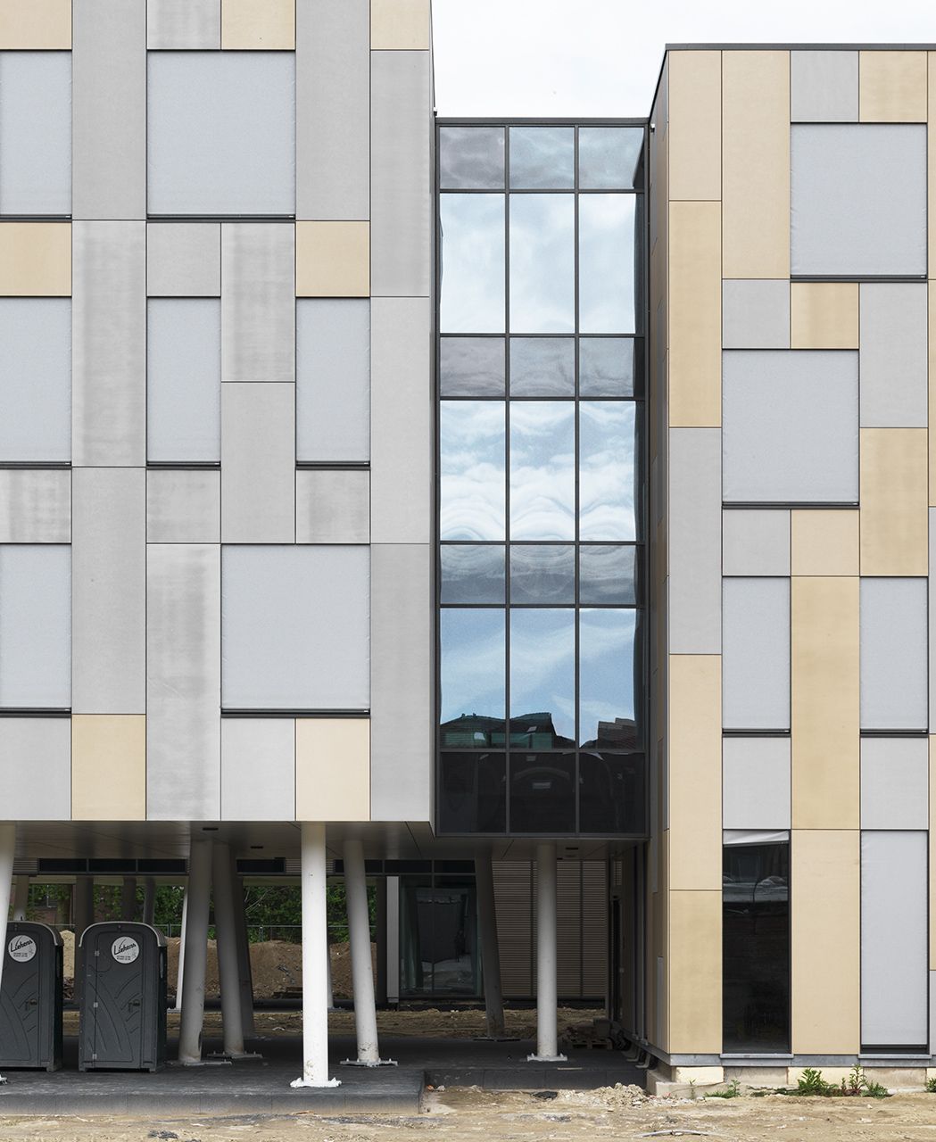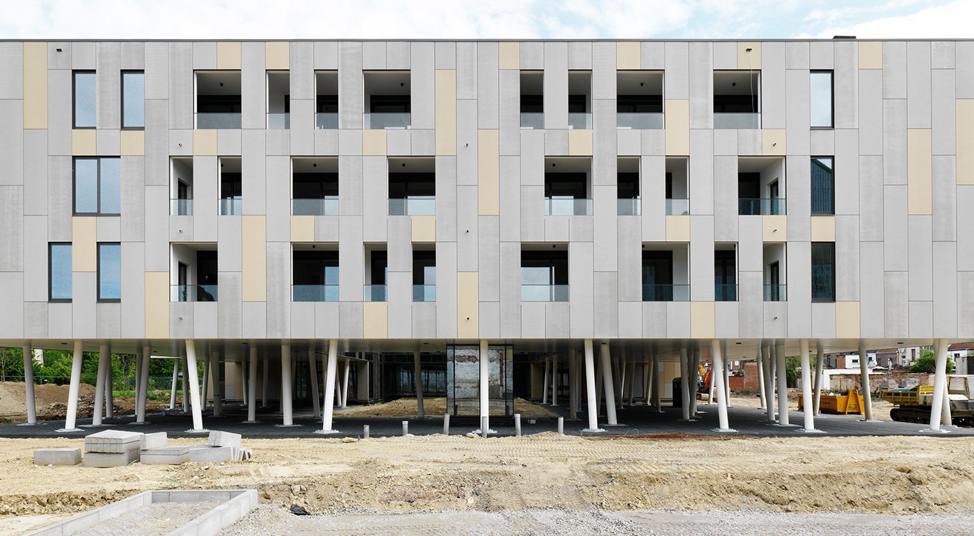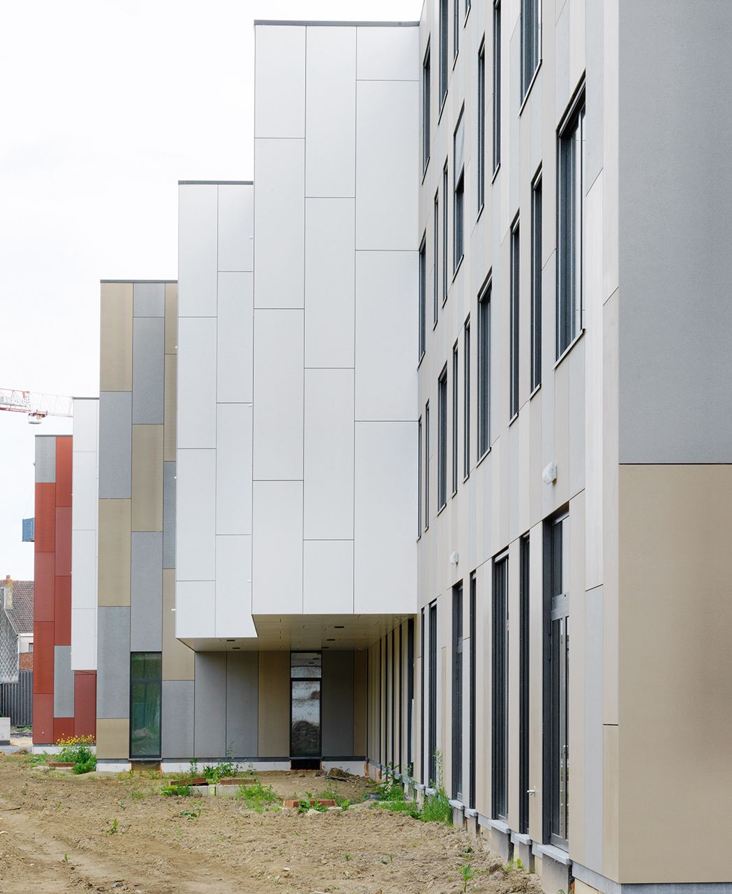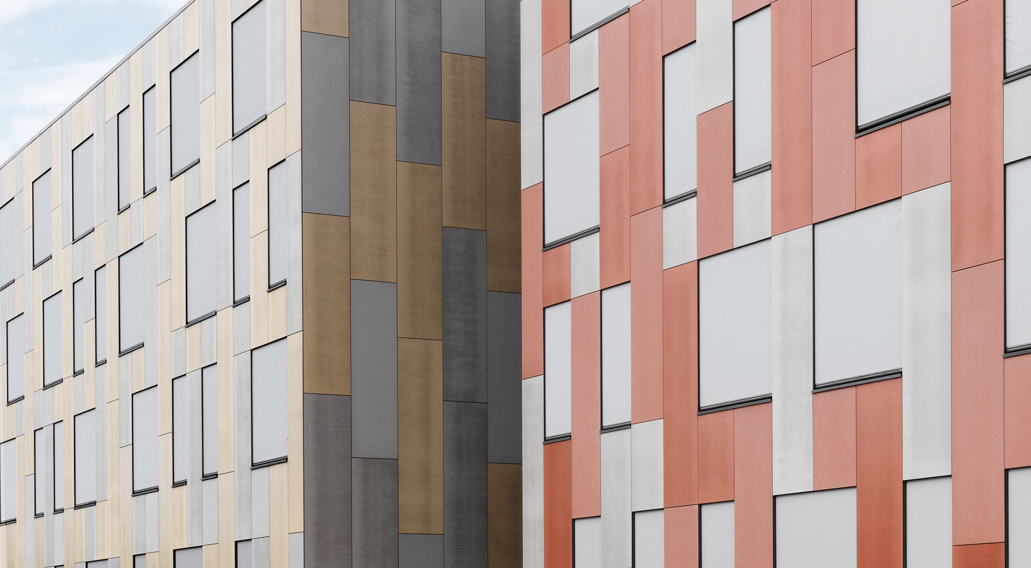 Die markante Fassade in vier verschienden Farben und zwei Oberflächen erzeugt ein spannendes Bild in Mitten des Wohngebietes. Die Gebäude umfassen vier Etagen: das Erdgeschoss bietet Platz für öffentliche Flächen, die Obergschosse beherbergen je 32 Wohneinheiten. Fotos: Ditz Fejer