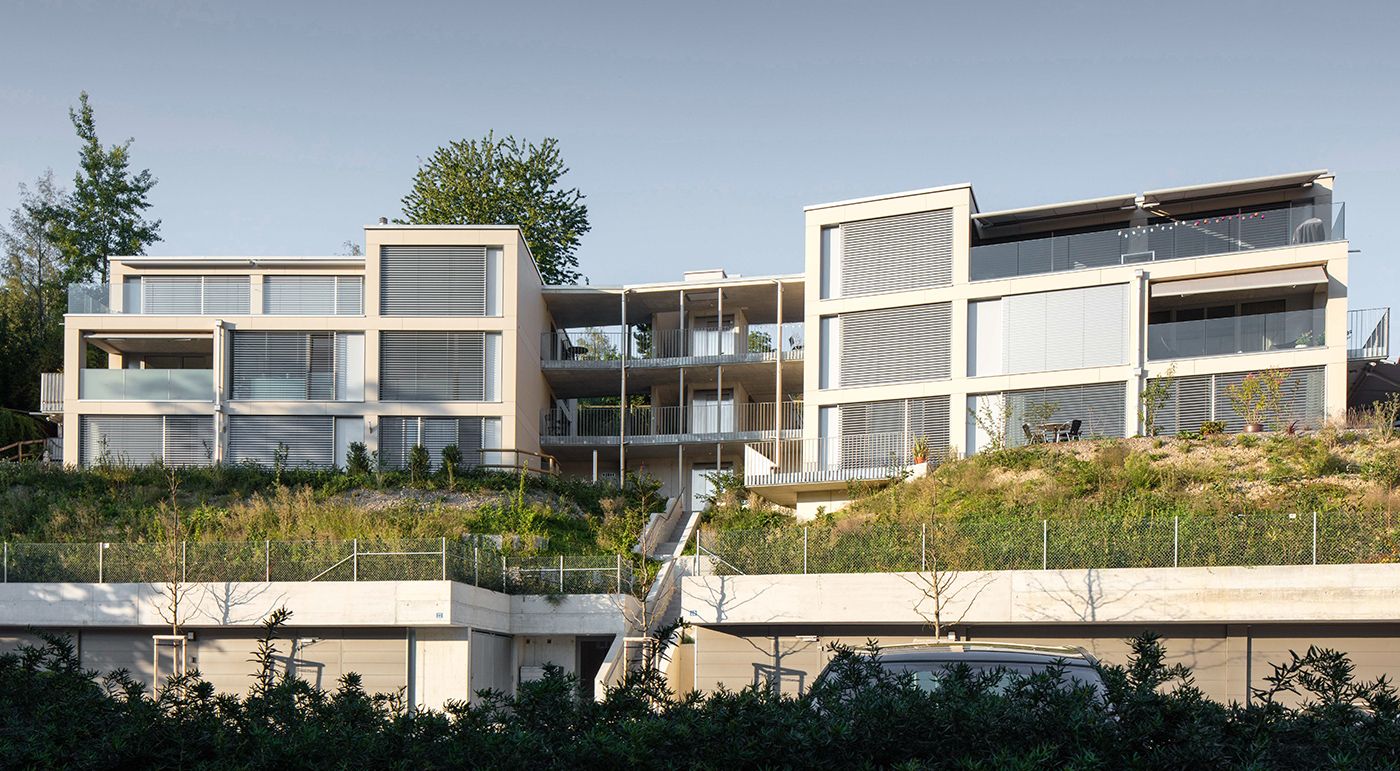 Zwei gespiegelte Baukörper fügen sich in Hanglage optimal in die Landschaft ein. Das schlichte Farbkonzept in Naturstein-Tönen sowie der Einsatz von hochwertigen Materialien lassen das Gebäude zurückhaltend und elegant wirken. Die nachhaltigen concrete skin Elemente in der Farbe sahara passen daher perfekt in das Konzept der Architekten. Großzügige Fensterfronten bringen ausreichend Tageslicht in die Wohnräume. Fotos: Dirk Podbielski