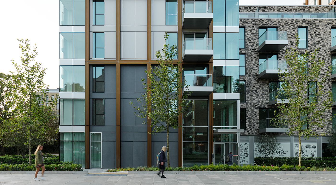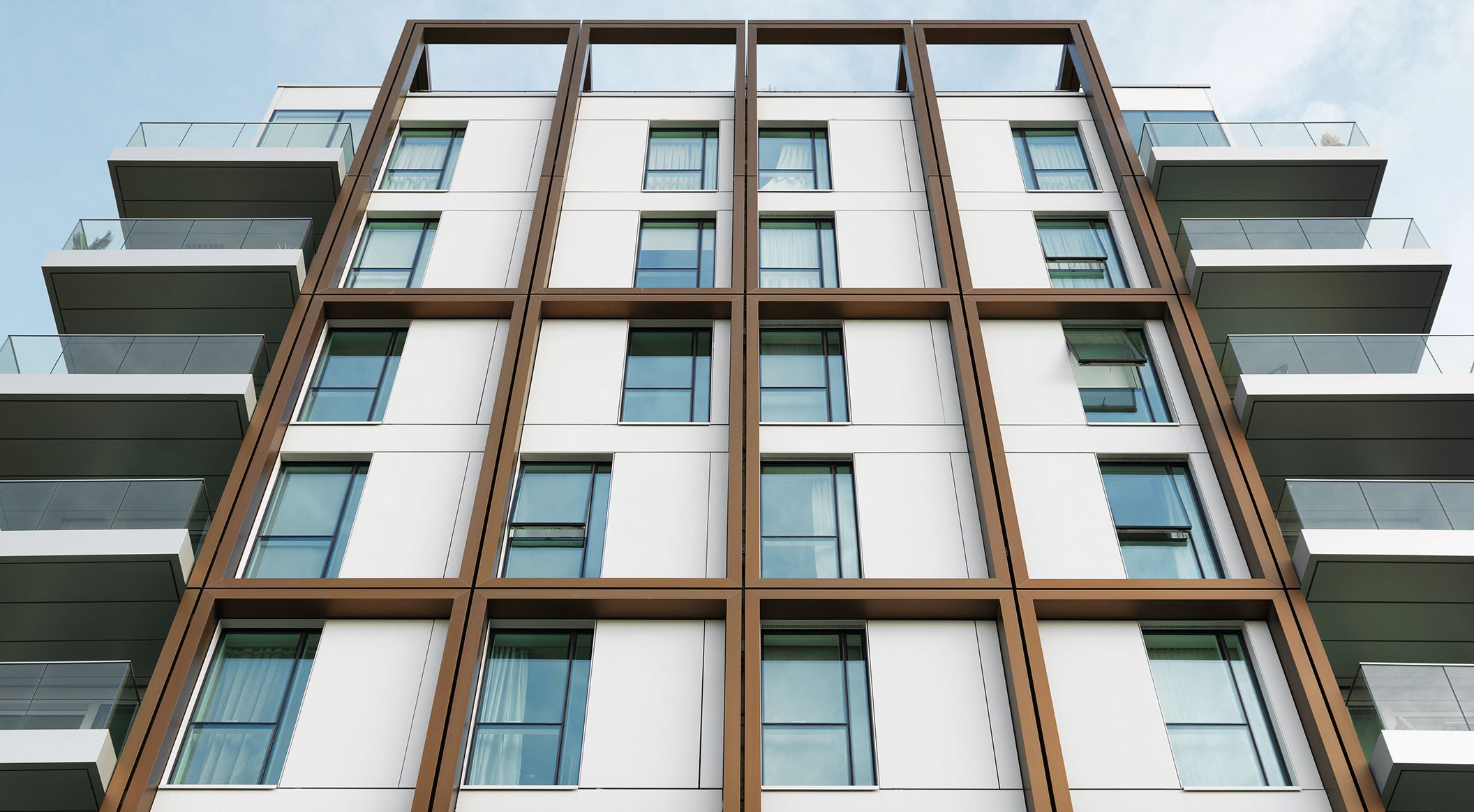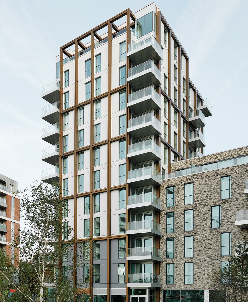 Woodberry Down ist ein äußerst erfolgreiches Sanierungsprojekt zur Bekämpfung von Armut und zur Verbesserung der Lebensqualität benachteiligter Menschen. Das Areal wurde nach und nach in ein hochwertiges Wohnviertel umgewandelt. Schon während der Bauzeit hat das Projekt einige Preise gewonnen. Das Gebäude Block F wurde mit concrete skin Platten in off-white und anthracite verkleidet. Fotos: Ditz Fejer