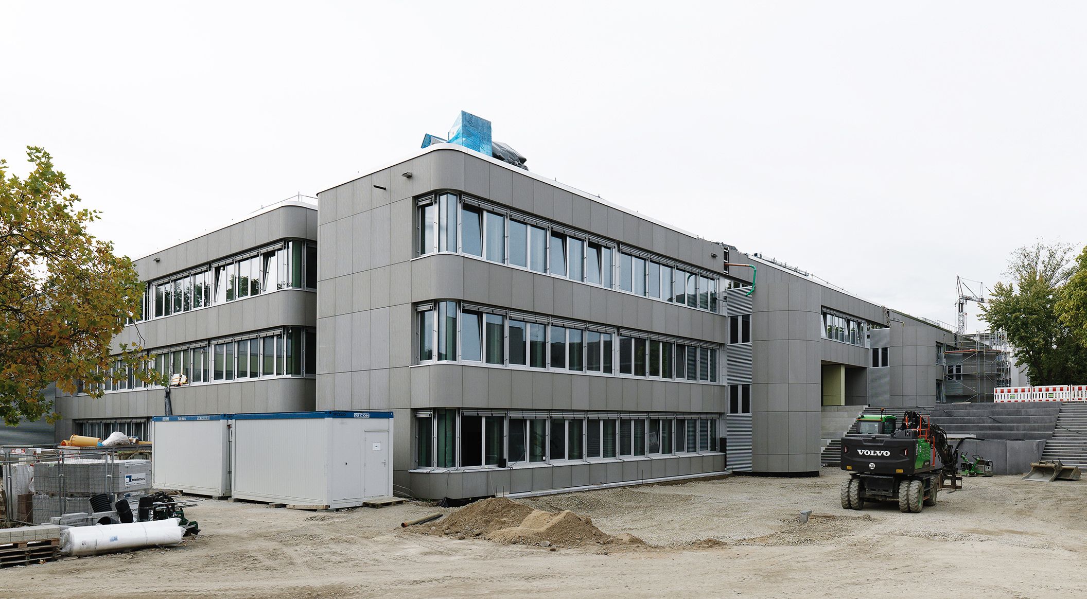 The Friedrich-Rückert grammar school with a new facade made of glassfibre reinforced concrete – brutalist architecture in a subtle and modern new guise
