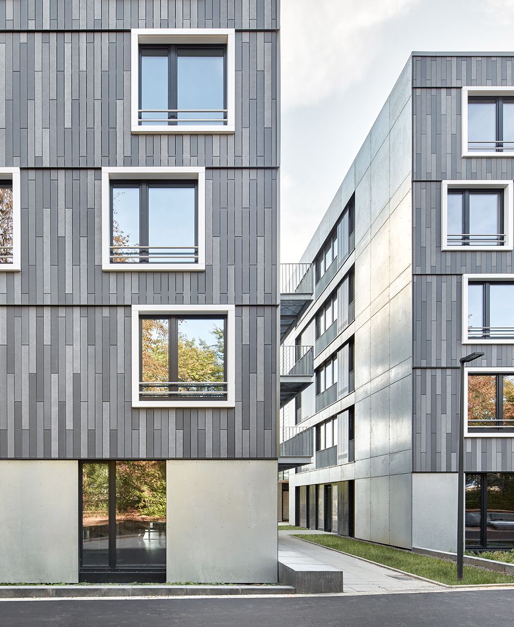 The complex was developed as a modular system consisting of prefabricated elements. The factory assembly of windows, building services and the facade resulted in ecologically optimised components with a wide range of design options.