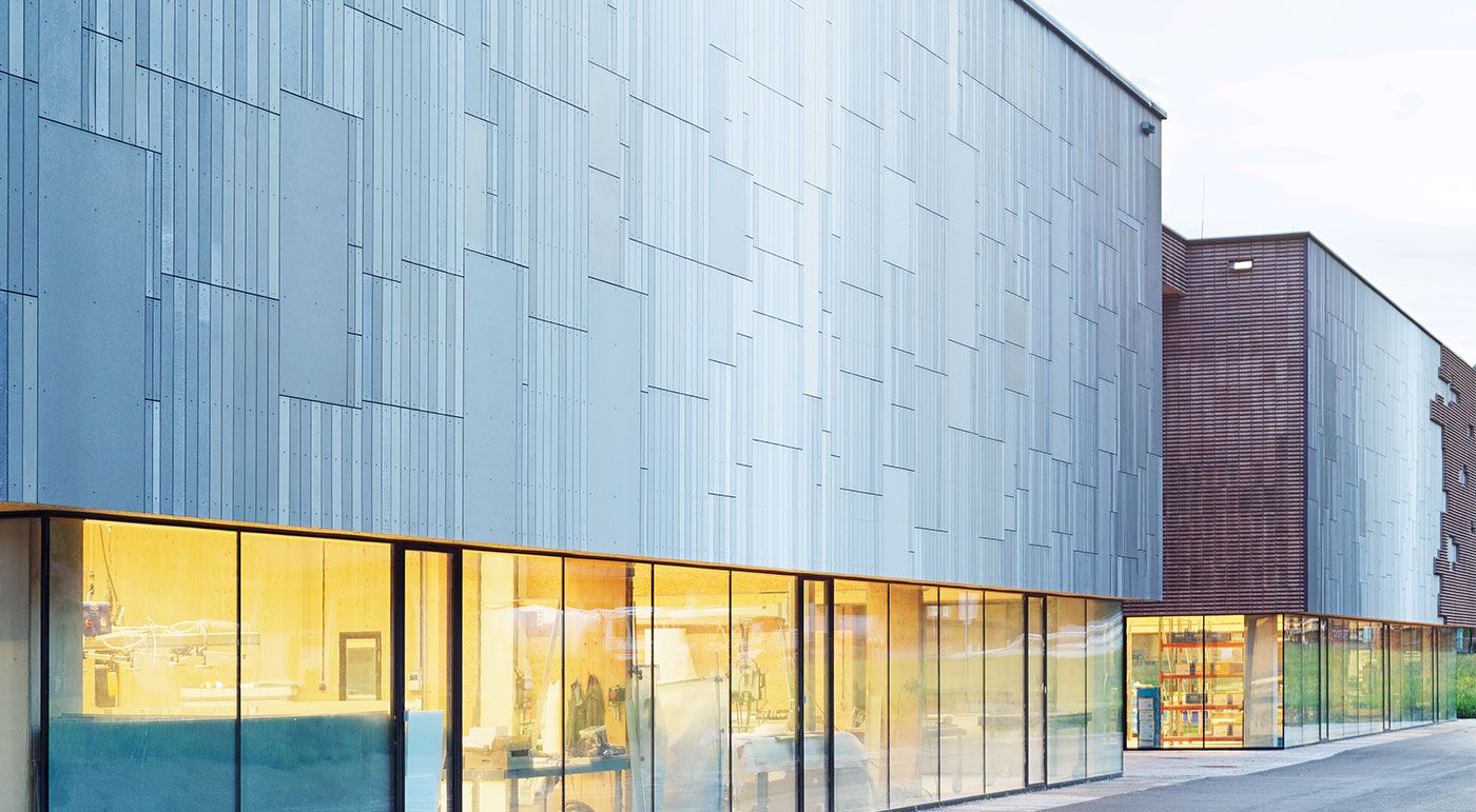 Parts of the production halls were clad with discarded absorbers that would otherwise have been disposed of. The front facades of the two halls were covered with production offcuts of glassfibre reinforced concrete. Thanks to comprehensive data analysis of the offcuts, an innovative method of cataloguing and generative algorithm-based design, the architectural design process was reversed: existing material became the basis for a new facade design. Over 500 m² were created from the offcuts and rearranged like a patchwork quilt. In doing so, waste was given a new life, waste volume reduced and resources conserved. By working with the material available and embracing the conditions it presented, a completely new facade aesthetic emerged. This flagship project demonstrates how resource-efficient construction and innovative design can go hand in hand.