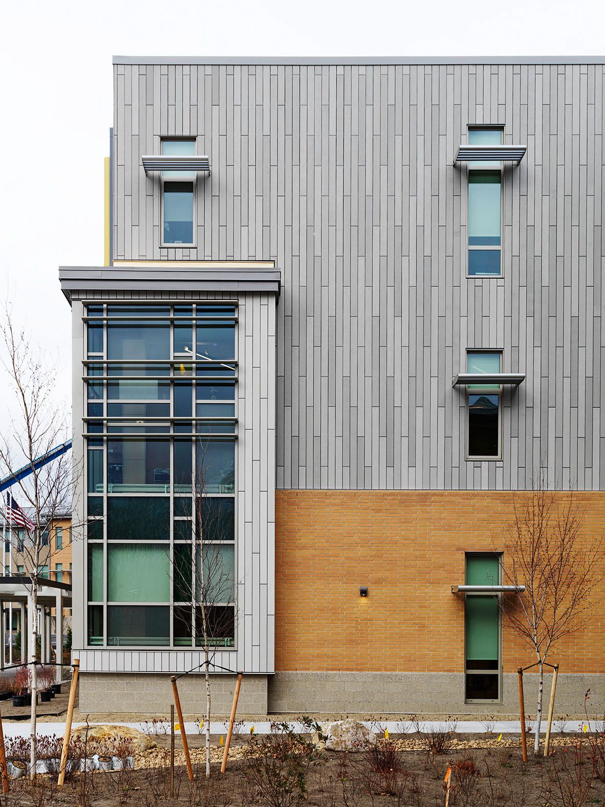 Colour gradients with only one hue - The varying degrees of sandblasted surfaces create vibrant accents on the building envelope.