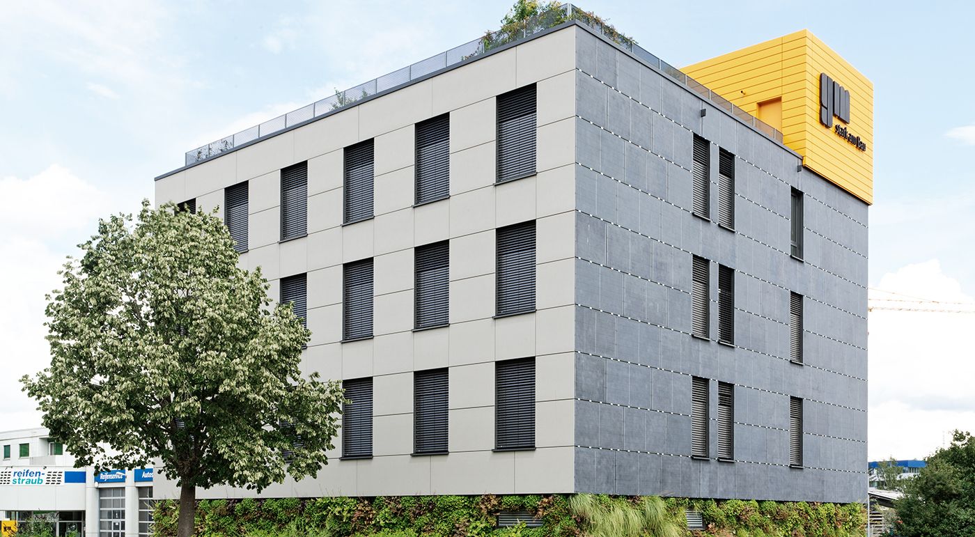 The foundation stone for the construction company Grüner and Mühlschlegel was laid as early as 1924. After nearly 100 years of company history and continuous growth, it was time for a new administrative building. Under the motto 'greener and more modern', the architects from Stäblein planned a new complex that reflects the company's philosophy and performance. A rooftop landscape serves both as a recreation and utility garden for the employees. Together with the facade greenery at the base, it actively contributes to environmental protection. The company also aims to take ecological responsibility with the building envelope. Therefore, the facade was clad with concrete skin panels, which were convincing in terms of sustainability. But also, aesthetically, the elements blend harmoniously into the overall concept. Photos: Ditz Fejer