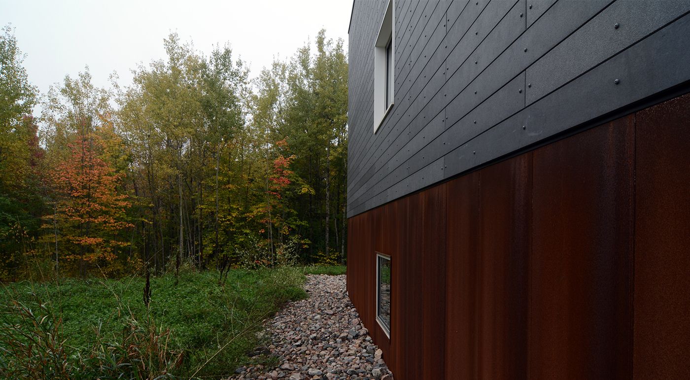 The facade integrates the scenery of the environments of industrial mining and the dense forests of northern Minnesota. The ribbon window offers bright treatment rooms and a view of nature for the patients.