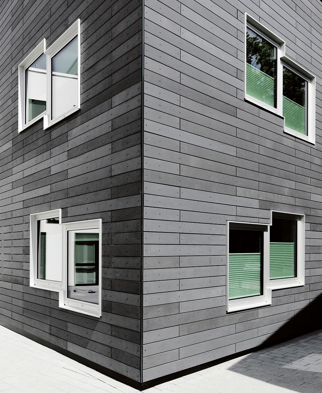A modern office centre was built on the former premises of the glass office in Gießen. The extensive area houses various building complexes that set individual architectural benchmarks. The architects of Gerhard Schymik opted for an öko skin facade in the colour liquid black. Fire protection, eco-friendliness, durable design with low maintenance, and an exceptional finish were the main arguments for the choice of the material. The öko skin facade paints an interesting picture, as the concrete slats are sandblasted to varying degrees, thus promoting a heterogeneous appearance.
