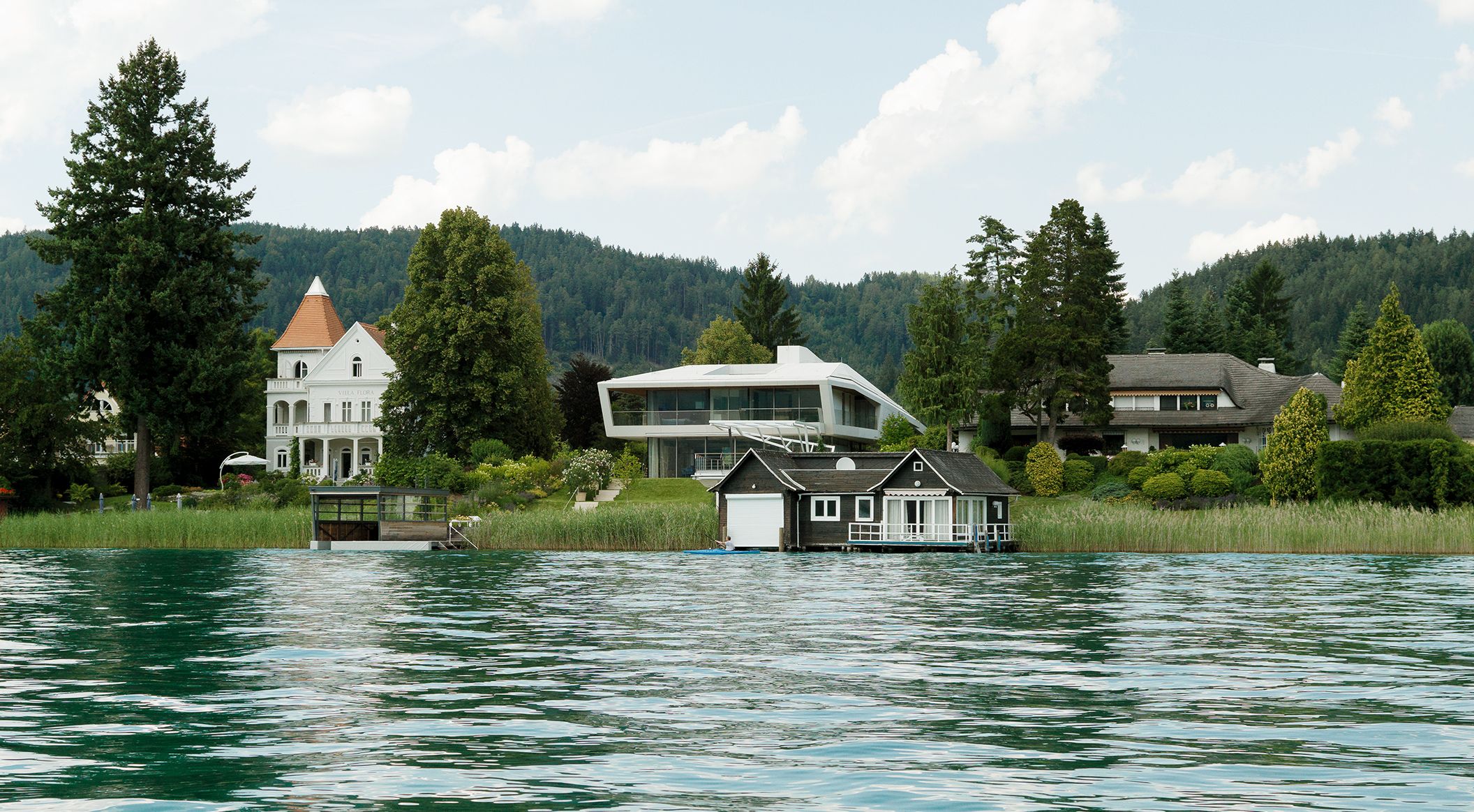 From the land, the building is reminiscent of the dynamic shape of a ship floating above the turquoise waves of the Wörther Lake in Carinthia/Austria. From the lake, the building, which transitions into a bathhouse and boat dock, appears like a terrace embedded into the landscape. Photos: Ditz Fejer