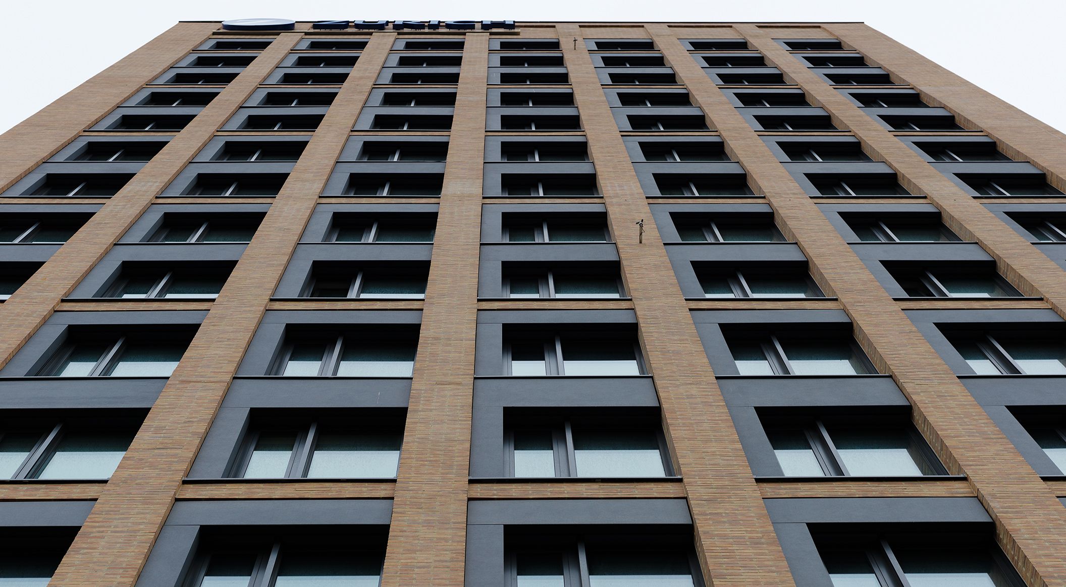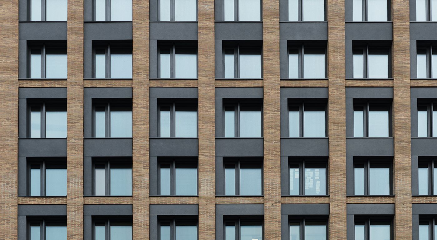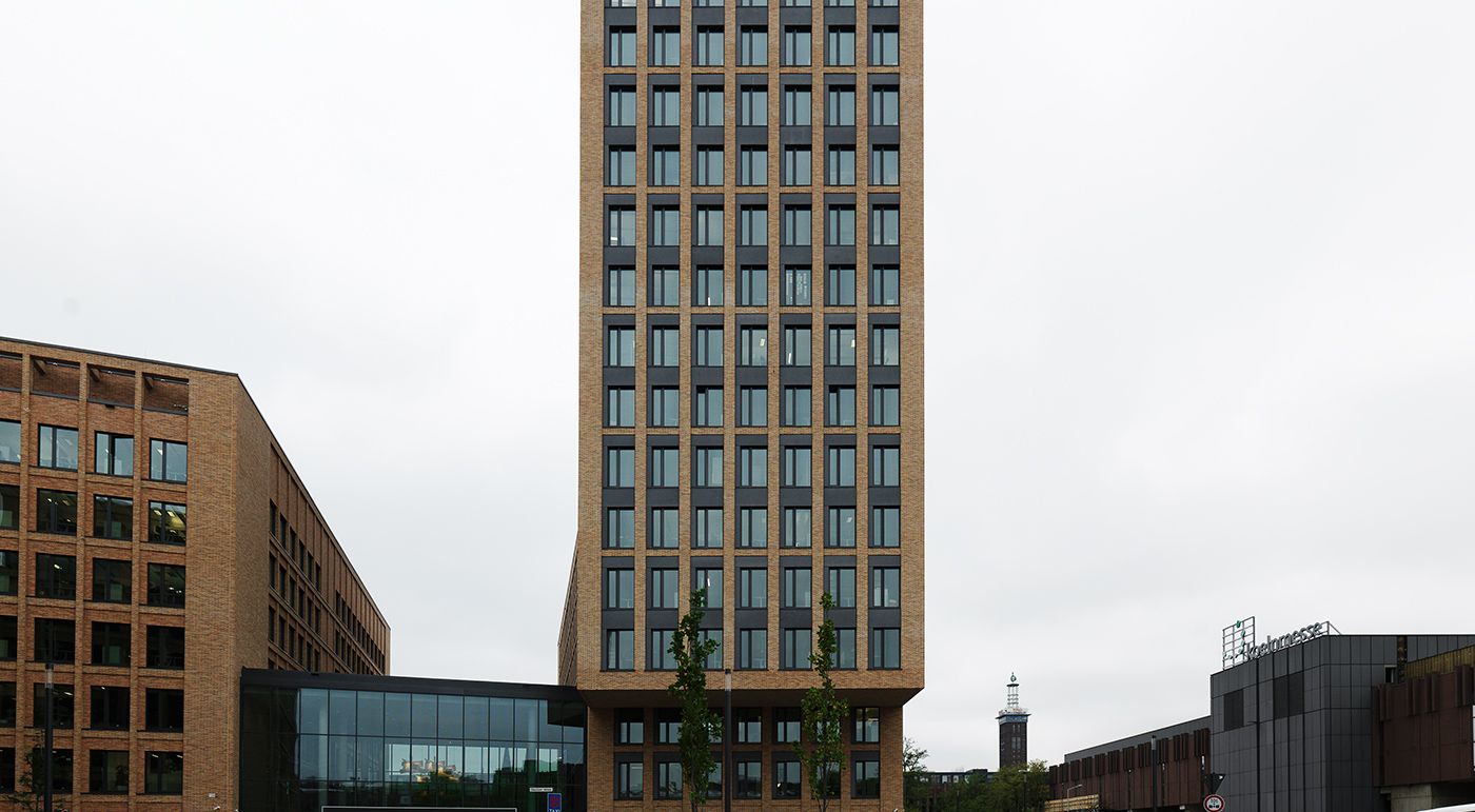 A 16 floor high-rise building rising to a height of 60 metres as well as other perimeter block structures create a stylish ensemble and blend in with the look of the adjacent trade fair buildings from the 1920s with their clinker brick facade. Sharp-edged formparts in anthracite were used as eye-catchers for the framing of the window elements. Photos: Ditz Fejer