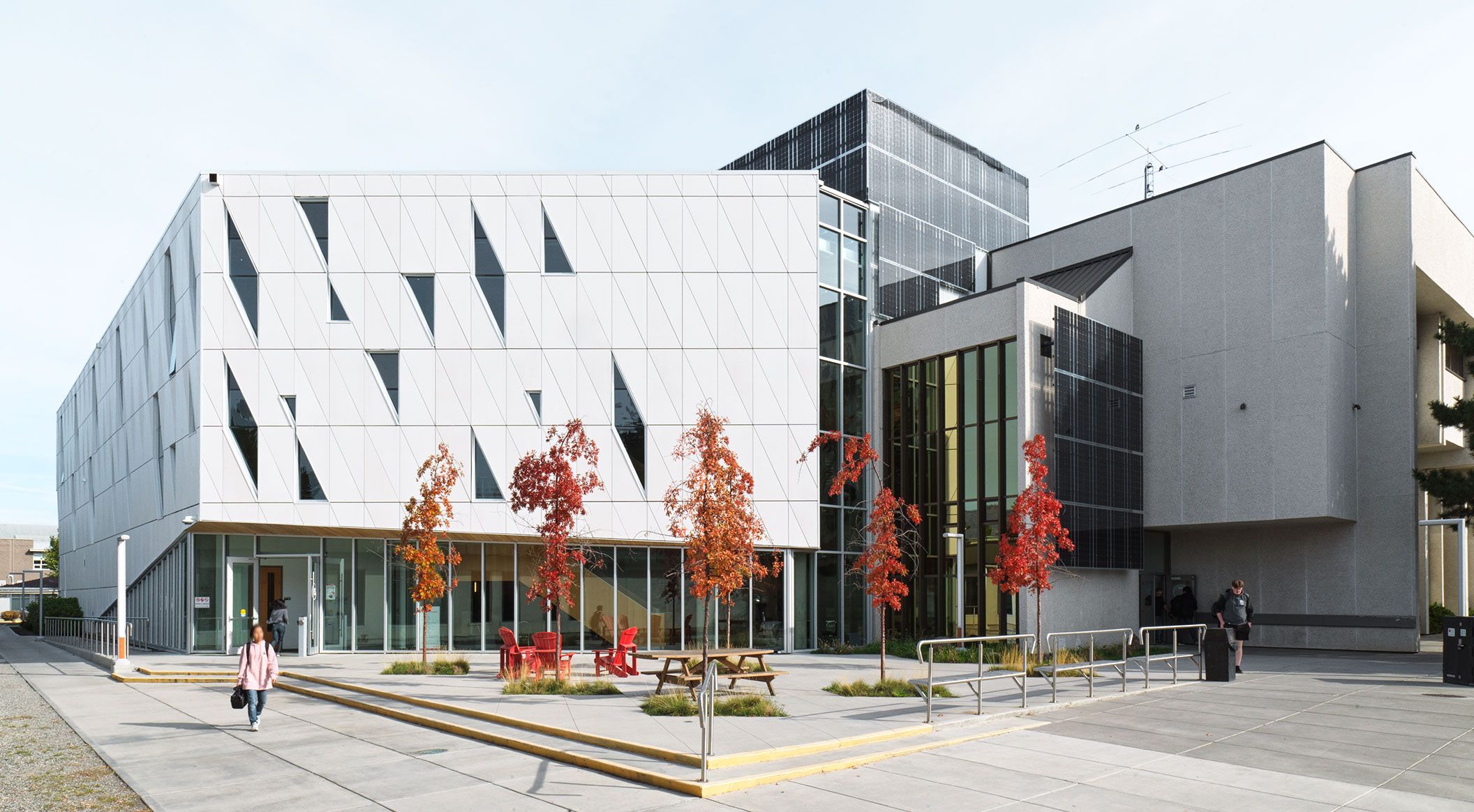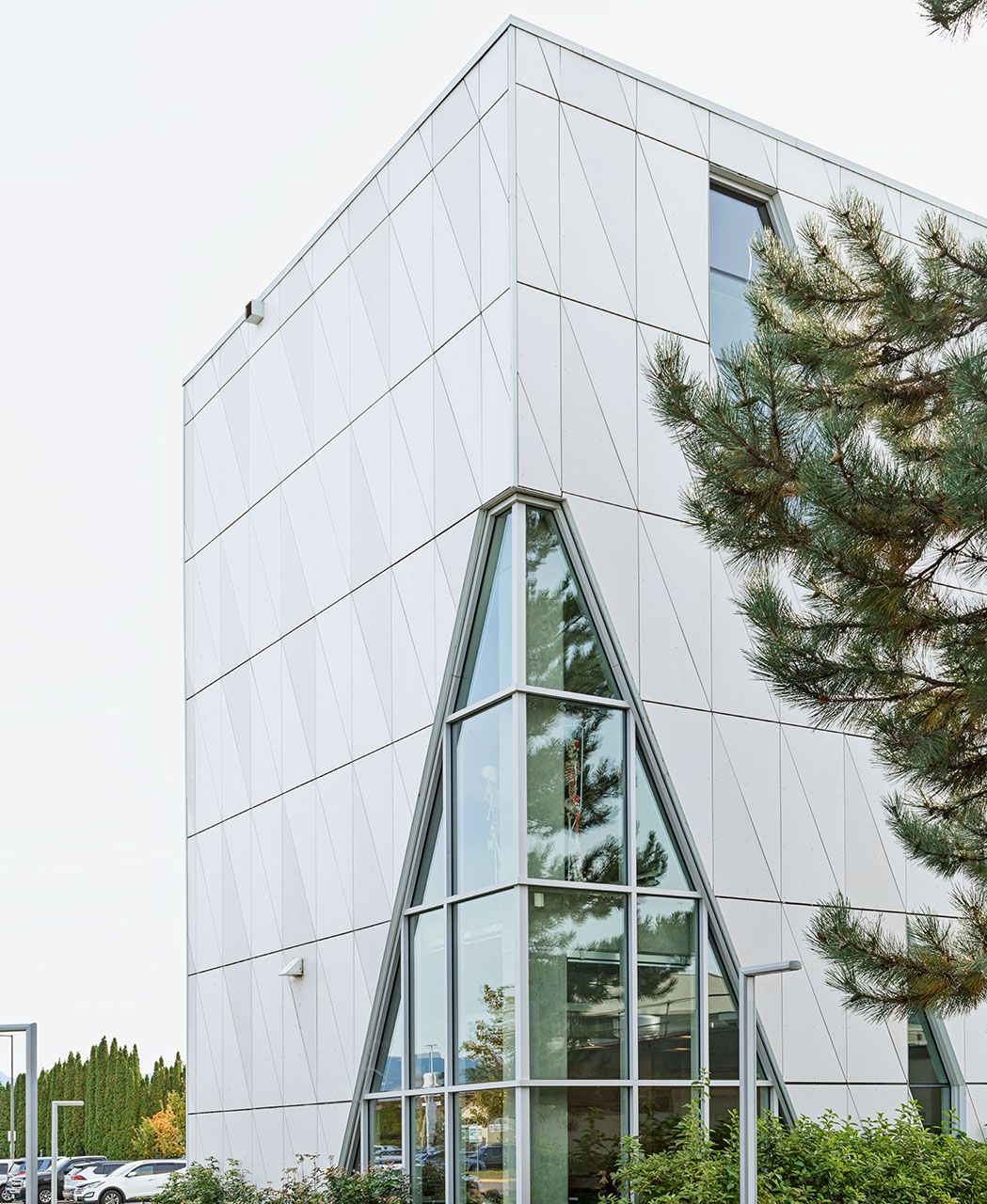 A new building for the Health Sciences Centre was planned for Okanagan College in Kelowna, British Columbia. The design focused on the students, creating effective learning and teaching spaces that incorporate the latest technologies. The architects at GEC selected concrete skin panels in polar white, which captivate with their distinctive design. Rather than opting for traditional rectangular cuts, they chose triangular elements, which were arranged to create an elegant diamond-shaped structure across the building envelope. The window surfaces also reflect this striking geometry, seamlessly integrating into the design. The complex sets new standards for sustainability and has been awarded LEED Gold certification. Photos: Ditz Fejer