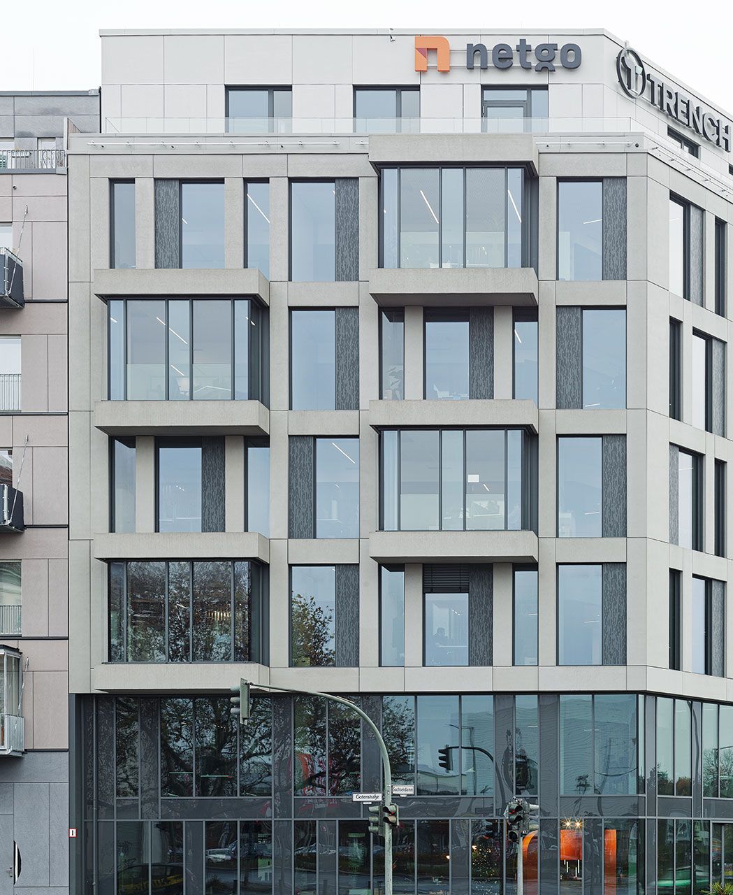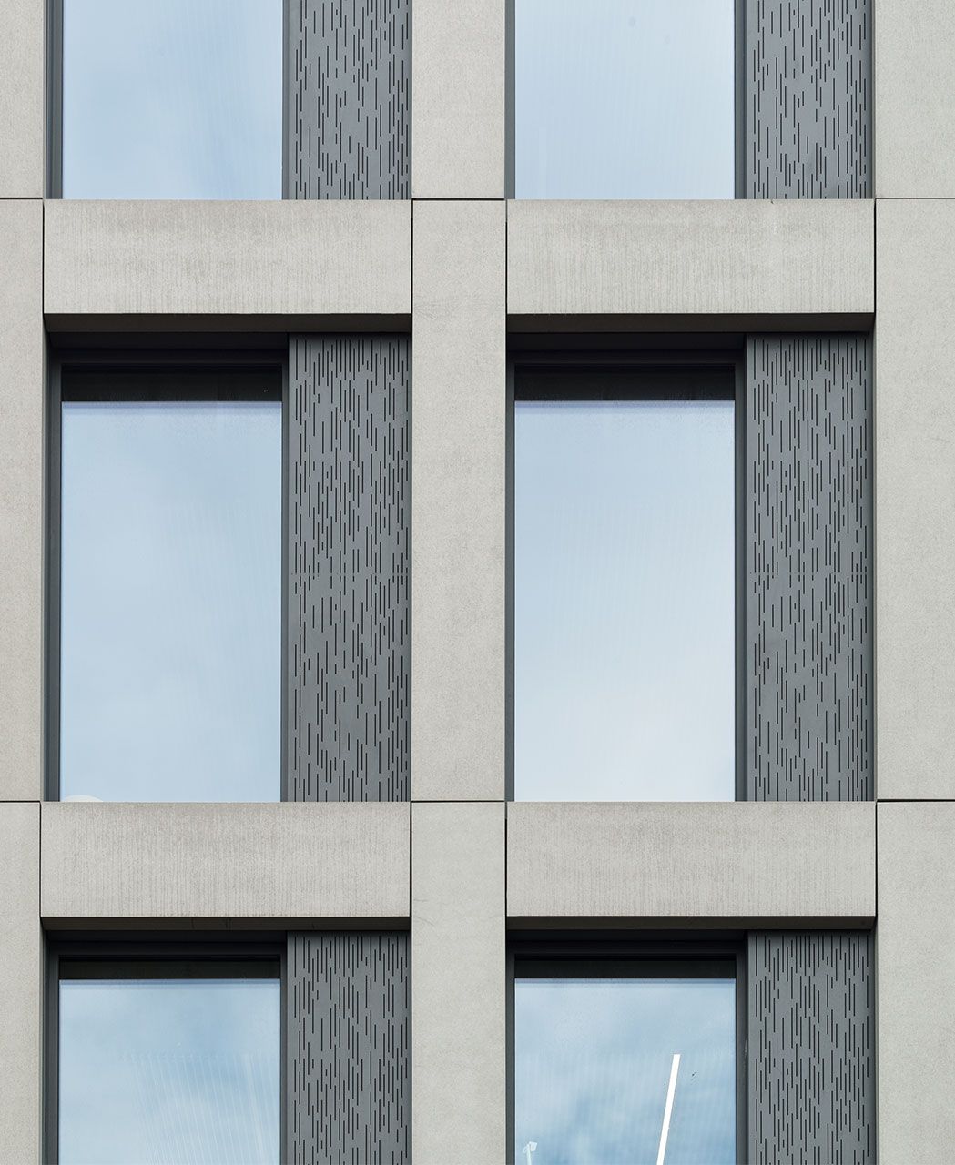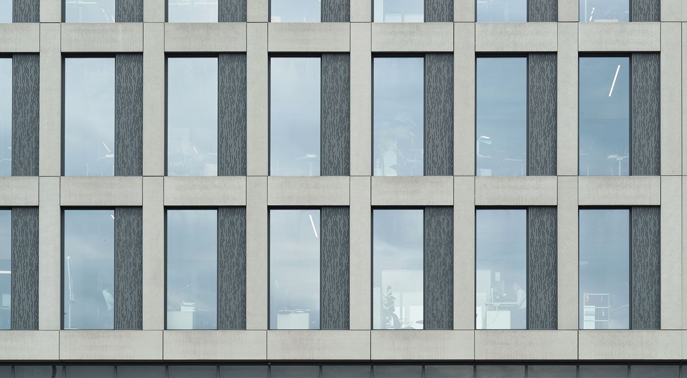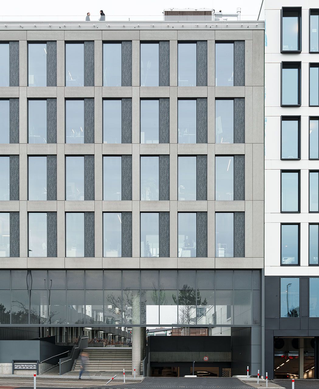 The seven-storey new building impresses with its distinctive facade made of concrete skin panels and three-dimensional formparts. The delicate glassfibre reinforced concrete elements frame the large window areas, giving the outer shell a clear, structured appearance. Photos: Ditz Fejer