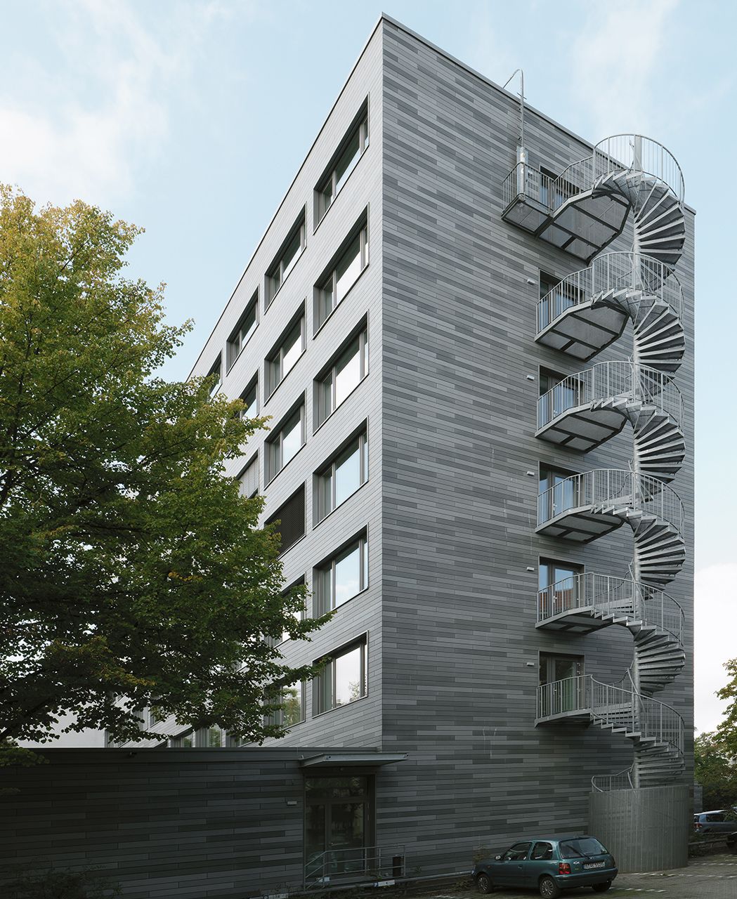 The branch office of the Schöneberg tax office was renovated with energy and fire protection aspects in mind. The office building from the 1960s was given a new sustainable outer shell with the glassfibre reinforced concrete elements. The narrow slats in three different surfaces create a lively play of colour on the facade. The shades of grey discreetly blend into the green surroundings. Photos: Ditz Fejer