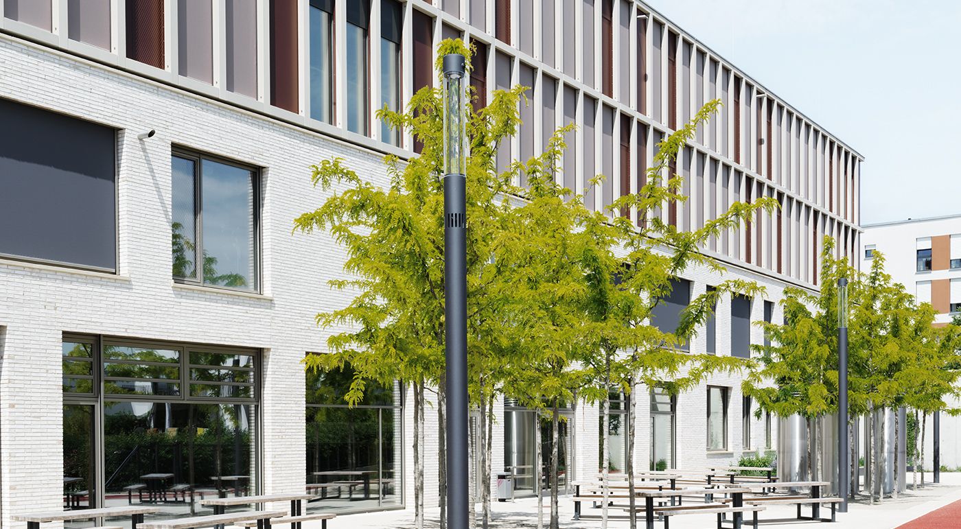 The new building of the Steinpark schools forms the southern end of a newly emerging district. The newly developed ensemble, consisting of a four-storey primary school, a five-storey secondary school and a sports hall, blends in with the surrounding buildings in terms of height and location. The concept includes generous green spaces, schoolyards and a sports park. The lower part of the outer shell was clad with beige clinker bricks. In the upper area, formed parts in the same shade create stylish accents. Photos: Ditz Fejer
