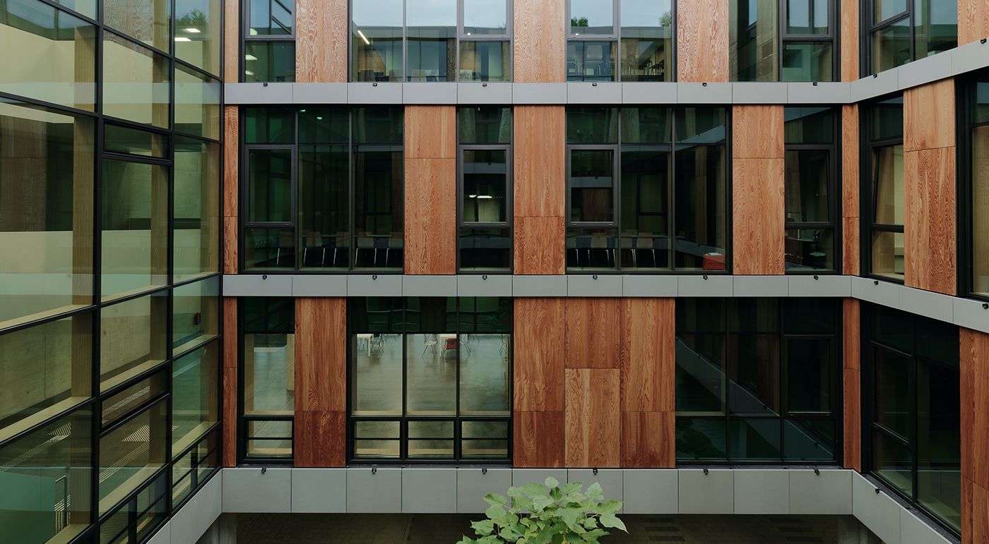 The building for sustainable chemistry is a new addition to the science centre at the Straubing campus and forms the northern end of the area. The elongated, three-storey complex accommodates lecture halls, seminar, office and meeting rooms, laboratories and a cafeteria. The entrance hall serves as the communicative centre and divides the building into a western and an eastern wing. The facade is dominated by the materials wood and concrete. The building features timber frame construction and insulating concrete as well as formed parts made from glassfibre reinforced concrete. The L-shaped elements give the outer shell a monolithic appearance. In combination with wood, this creates an exciting contrast of mixed materials.Photos: Ditz Fejer