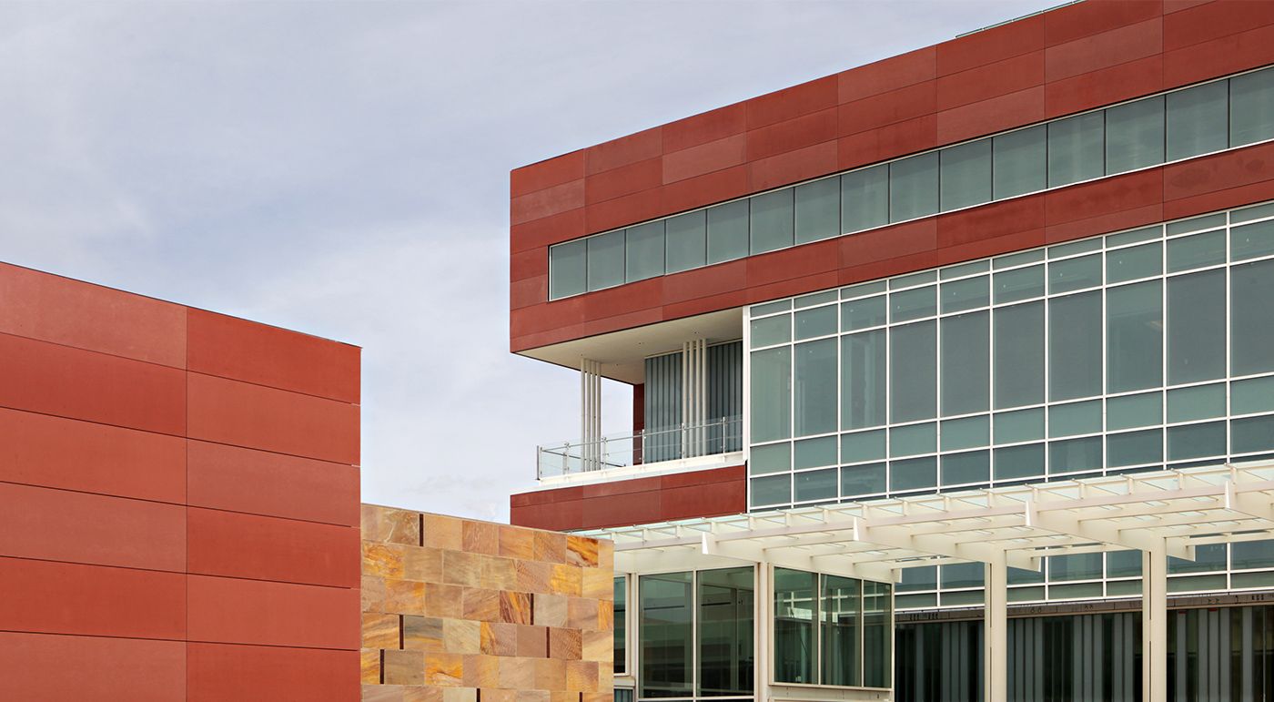 The Cancer Centre of the University of New Mexico is among the fifty best institutions for cancer research and treatment in the USA. The state-of-the-art five-storey building was designed with sensitivity for patients and visitors in mind. The design focused on large green spaces and a tranquil environment. The building was designed with sustainability in mind, which is why they opted for concrete skin panels. Natural raw materials, durability, low maintenance and total fire resistance are only some of the important ecological factors. Fire protection, eco-friendliness, durable design with low maintenance, and an exceptional finish were the main arguments for the choice of the material. The öko skin facade paints an interesting picture, as the concrete slats are sandblasted to varying degrees, thus promoting a heterogeneous appearance. Photos: Daniel Lunghi