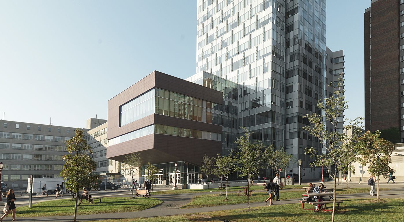 The university building was designed by Diamond Schmitt Architects in collaboration with KWC Architects. The lower five floors house classrooms, study rooms, and common rooms. The upper floors provide space for seminars, offices, and research for faculty, doctoral students, and staff. Photos: Ditz Fejer
