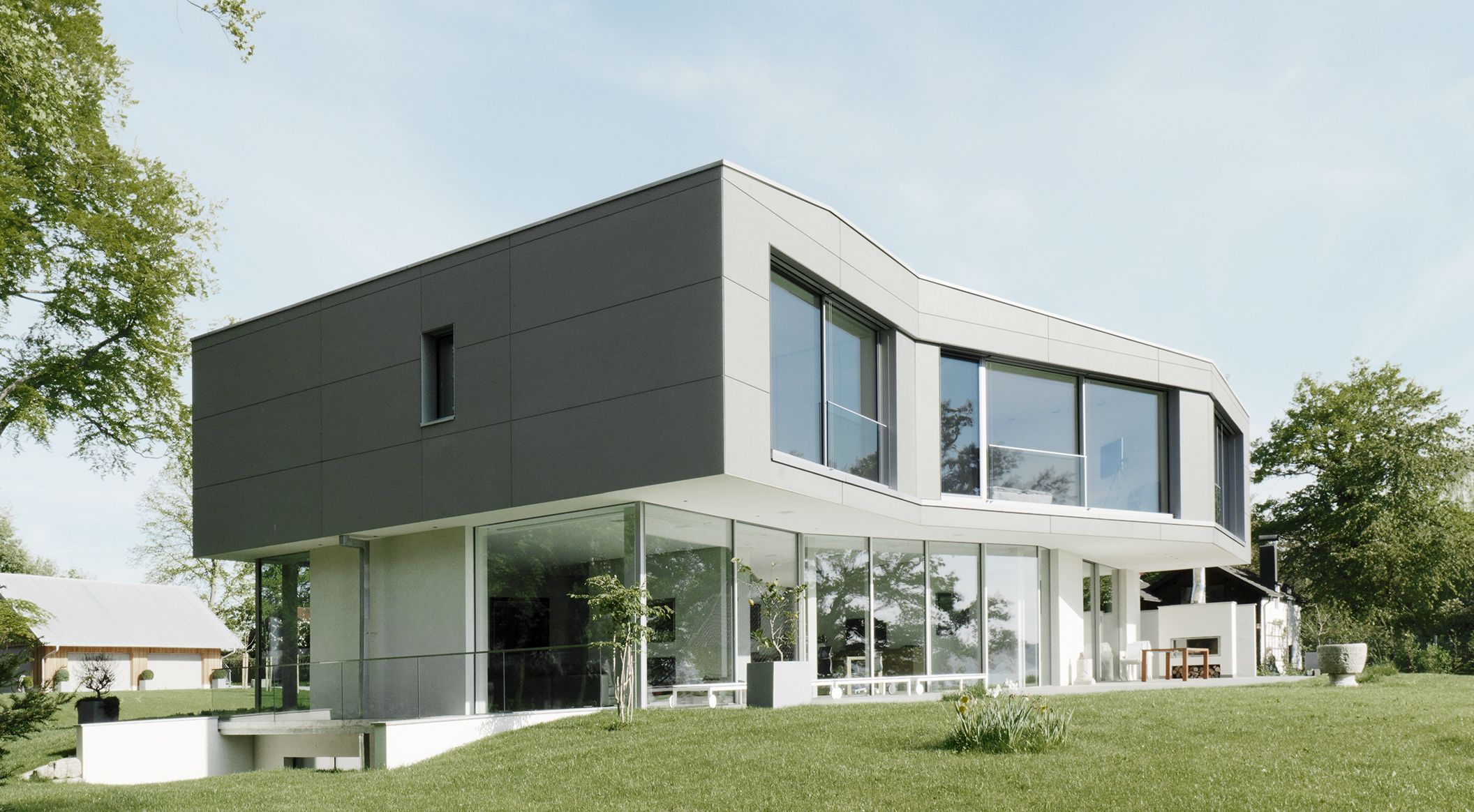 A light-flooded abode directly on Ammer Lake: Boos architects realised this dream home for a family. They designed a two-storey wing with an almost fully glazed ground floor. The striking facade of the upper floor was clad with concrete skin panels in silvergrey and forms a harmonious contrast to the restrained, bright facade on the ground floor, made of exposed concrete.
