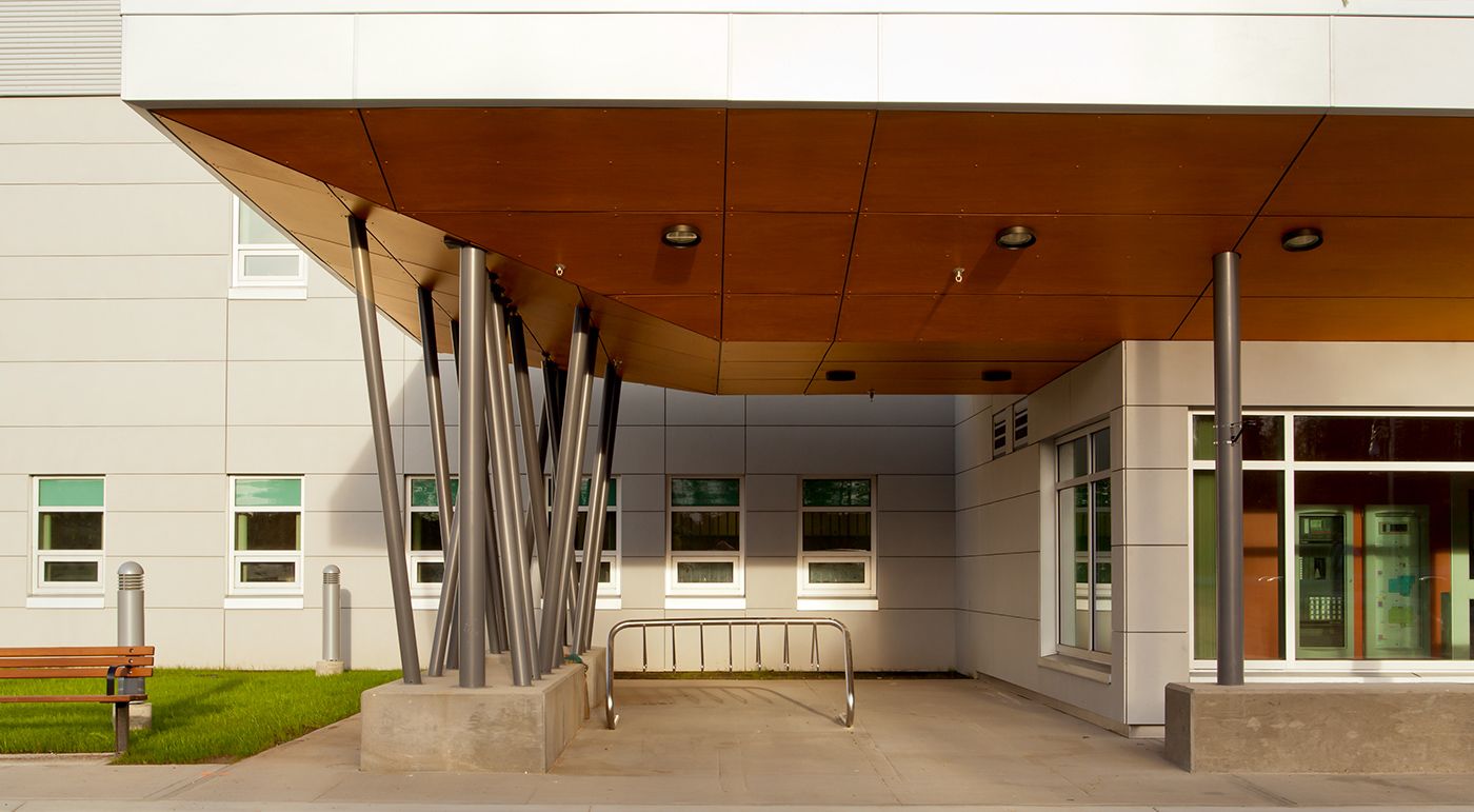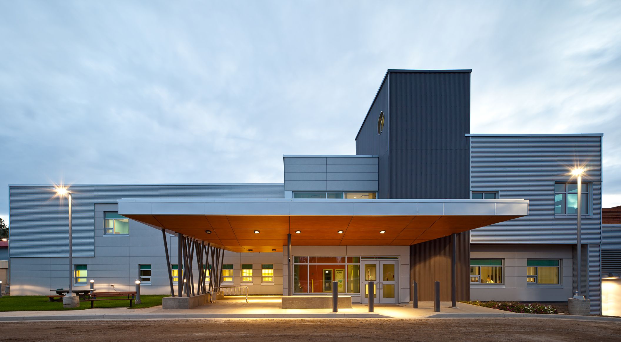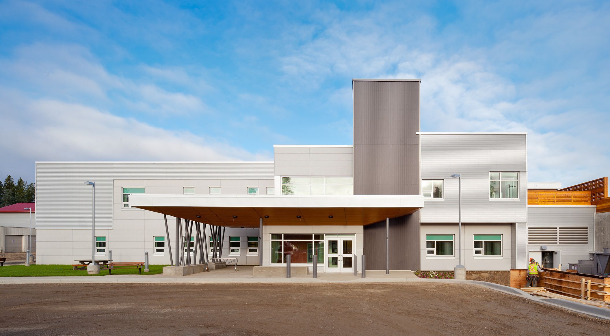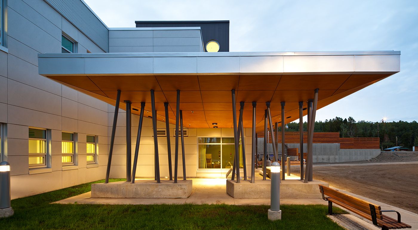 The architects at Kobayashi + Zedda and DGBK were faced with the challenge of turning an empty steel-framed building shell into a fully functional hospital. They adapted the existing building to the location’s natural features and designed modern premises. The columns in front of the lower entrance area form an abstract interpretation of the woods around Watson Lake. The building envelope was clad with concrete skin panels, which blend harmoniously into the surroundings. Photos: ANDREW LATREILLE / www.andrewlatreille.com