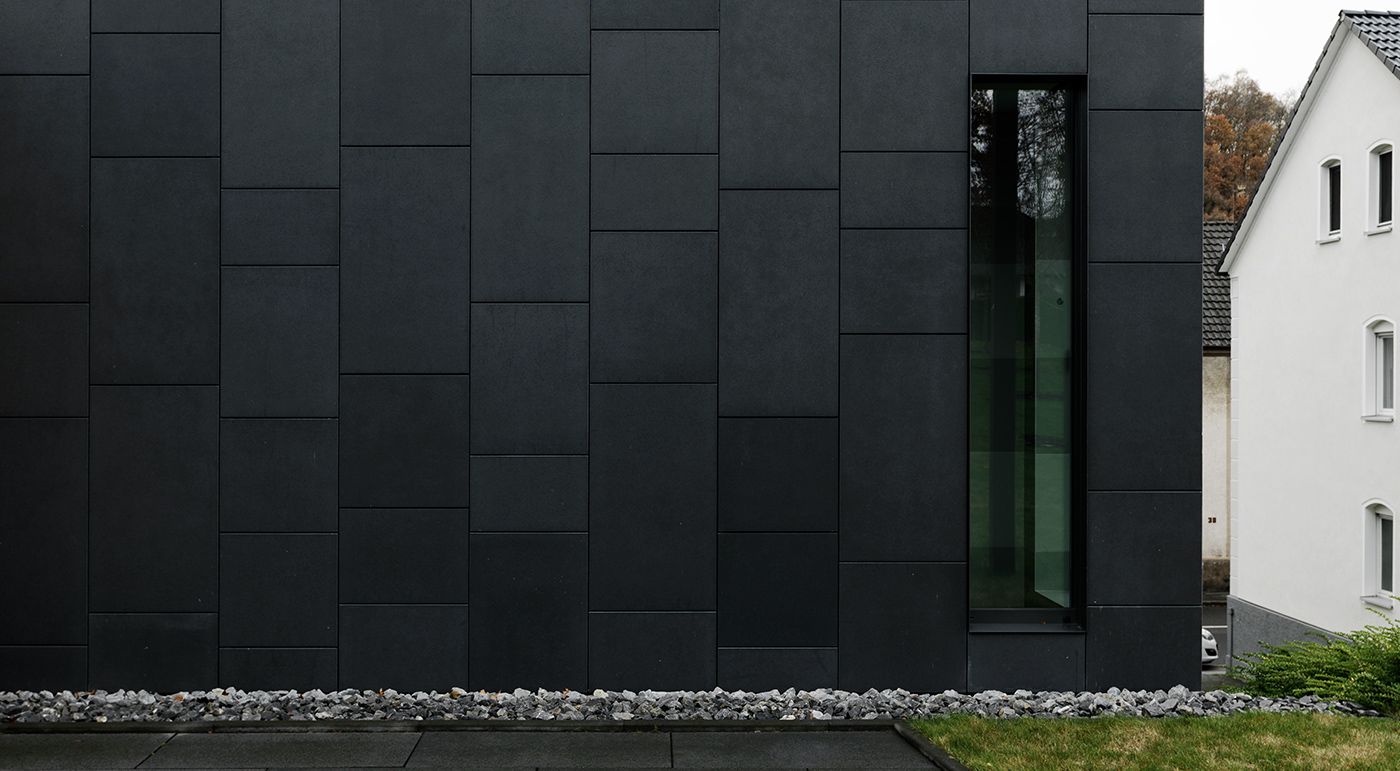 The clear, sharply contoured building volume stands freely and is intentionally set back. The facade of the new construction has been designed with concrete skin panels in the colour liquid black and is installed in a random pattern.