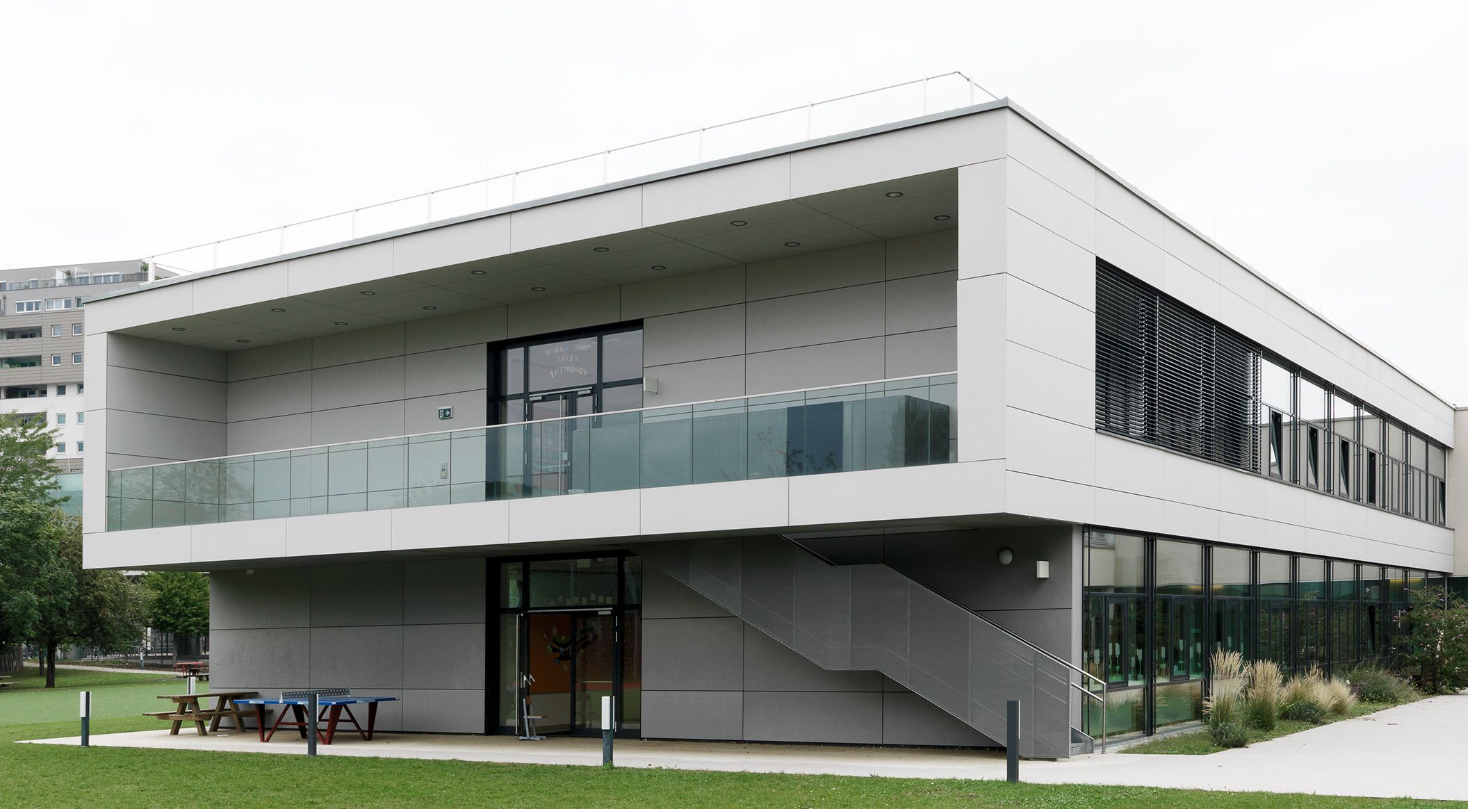The extension of the primary school in Wulzendorf was designed as a clear cuboid structure that blends in harmoniously with the existing building. An additional open courtyard offers maximum use of the open spaces. The facade was clad with light-coloured glassfibre reinforced concrete elements. Lage glass surfaces in the leisure area ensure sufficient sunlight. Photos: Ditz Fejer