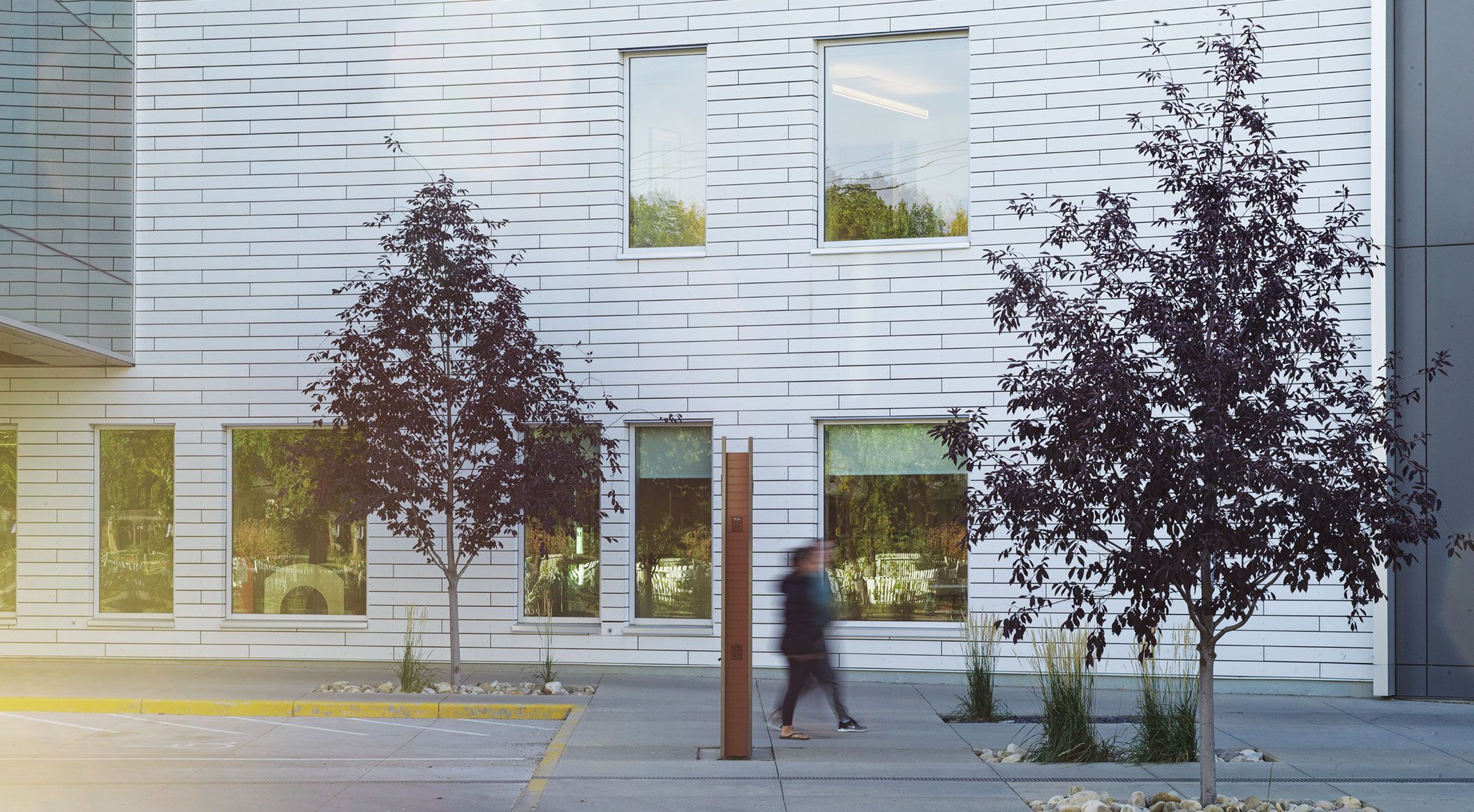 Rooted in trauma-informed design principles, the architecture promotes healing and meets the needs of women and their families. The welcoming entrance, featuring a sheltered overhang, warm timber cladding, gentle curves, and a long communal bench, creates a sense of arrival and safety. The building includes versatile multi-purpose rooms, a large community kitchen serving as a social hub, childcare facilities, and more. Photos: Ditz Fejer