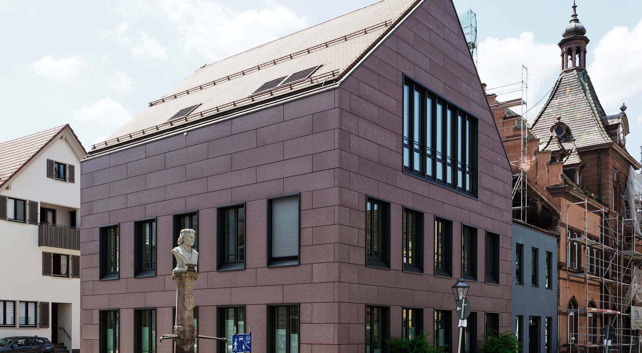 The new town hall building, through its simplicity and classic elegance, is in keeping with the original historic building. The colour scheme of the facade creates a design connection between the old and the new, creating a harmonious overall ensemble. At the same time, the new building features a contemporary and modern design with its facade made of dark red glassfibre reinforced concrete elements, providing a robust, low-maintenance and energy-efficient outer shell. Photos: Ditz Fejer