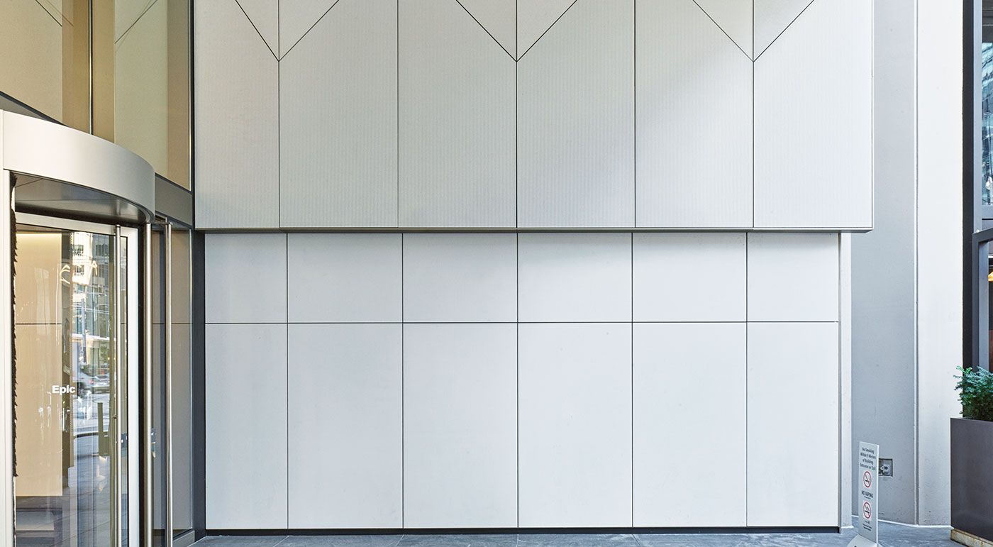Au 141 Adelaide Street West à Toronto, situé dans le quartier financier de la ville, de nouveaux espaces de bureaux et de commerce de détail sont en cours de développement. Les panneaux de béton "concrete skin" en finition groove et standard ont été utilisés à la fois à l'intérieur et à l'extérieur. La forme triangulaire des éléments en béton de fibrés de verre crée des accents raffinés à l'intérieur. Photos : Ditz Fejer